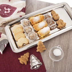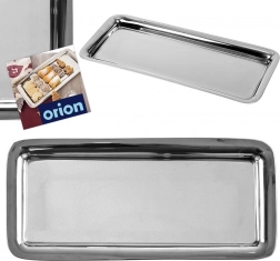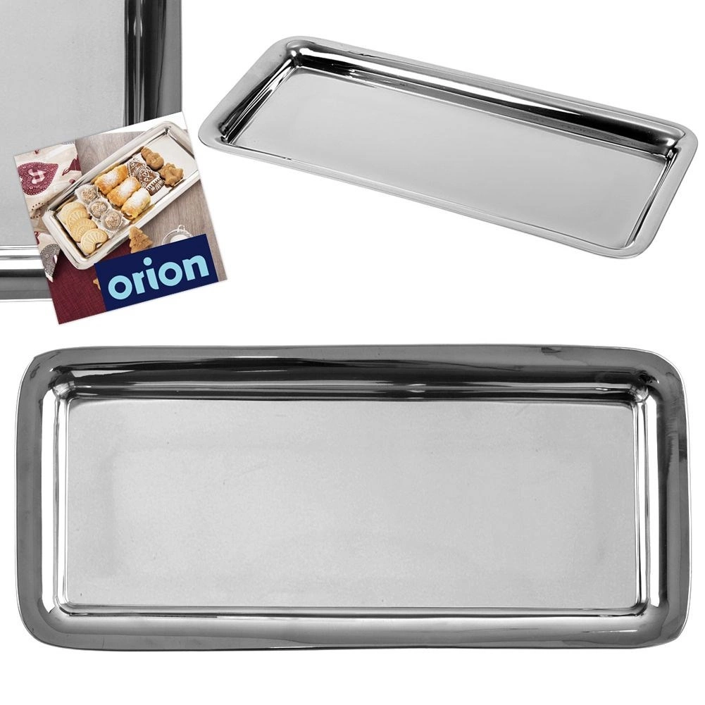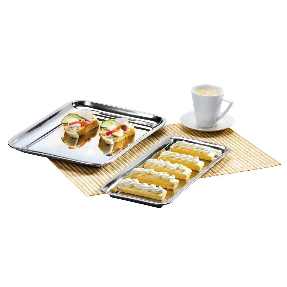 Praktyczna prostokątna taca z wysokiej jakości stali nierdzewnej w eleganckim srebrnym wykończeniu. Idealna do serwowania kanapek, kanapeczek, przystawek, ciastek i deserów. Dzięki podwyższonemu brzegowi wygodnie się nią manewruje, a jedzenie pozostaje bezpiecznie na miejscu.