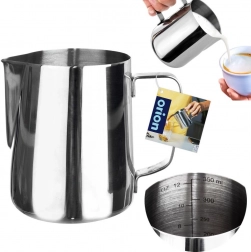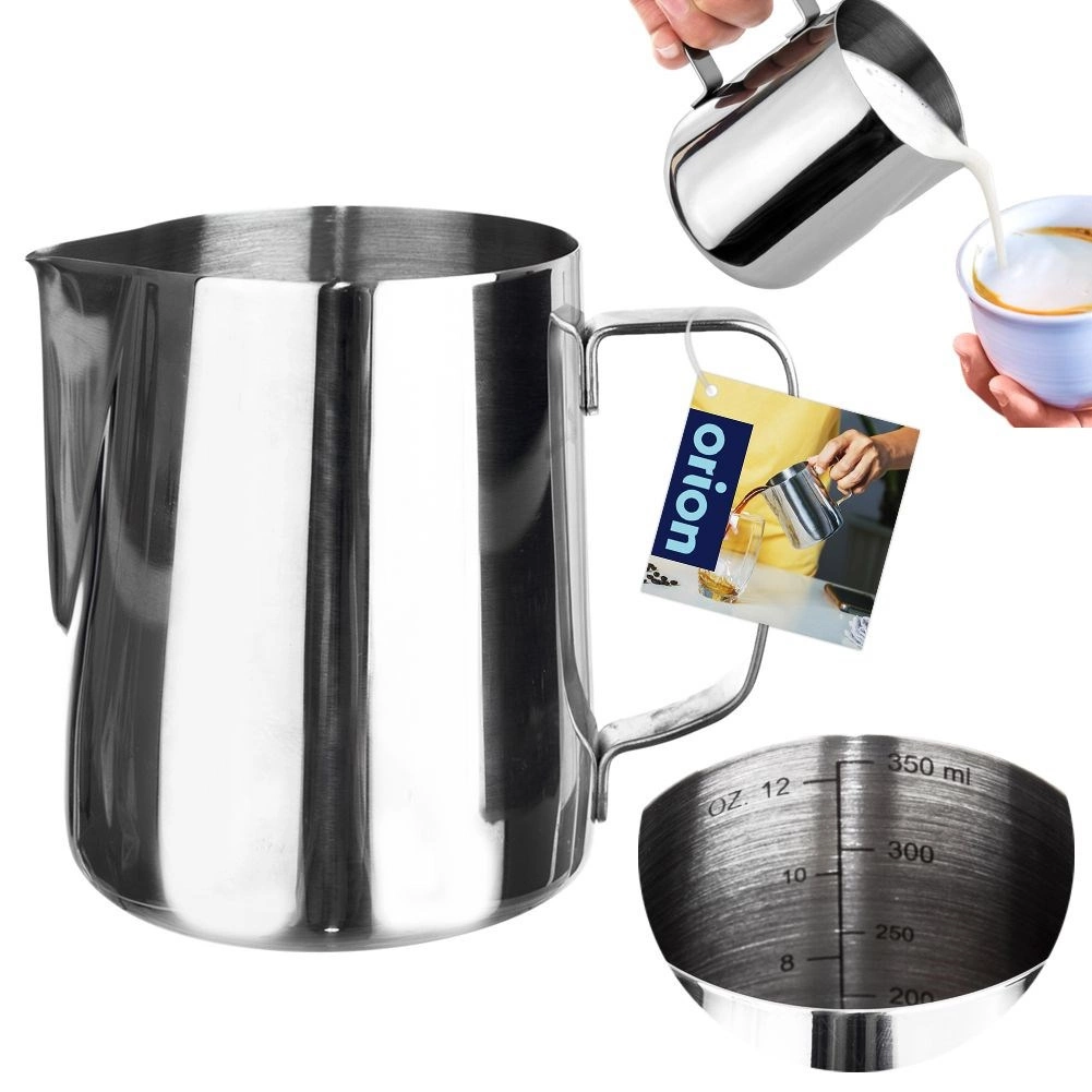 Nierdzewny dzbanek do mleka o pojemności 350 ml to idealny wybór do domowego i kawiarnianego przygotowywania kawy. Dzięki precyzyjnej wylewce łatwo nalejesz mleko do cappuccino czy latte, a wewnętrzna podziałka co 50 ml zapewni dokładne odmierzenie potrzebnej ilości. Solidne ergonomiczne ucho ułatwia manipulację nawet przy gorącej zawartości.