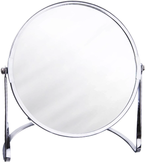 Eleganckie, dwustronne kosmetyczne lusterko na stojaku ze srebrną ramą jest idealne do makijażu i codziennej pielęgnacji. Oferuje klasyczny obraz oraz powiększenie 2×, ma średnicę powierzchni lustrzanej 17 cm i prezentuje się stylowo oraz minimalistycznie w każdym wnętrzu.