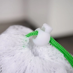 Plastikowy stoper ze ściągaczem zapewnia niezawodne zamknięcie woreczka bez ryzyka uszkodzenia prania ani pralki.