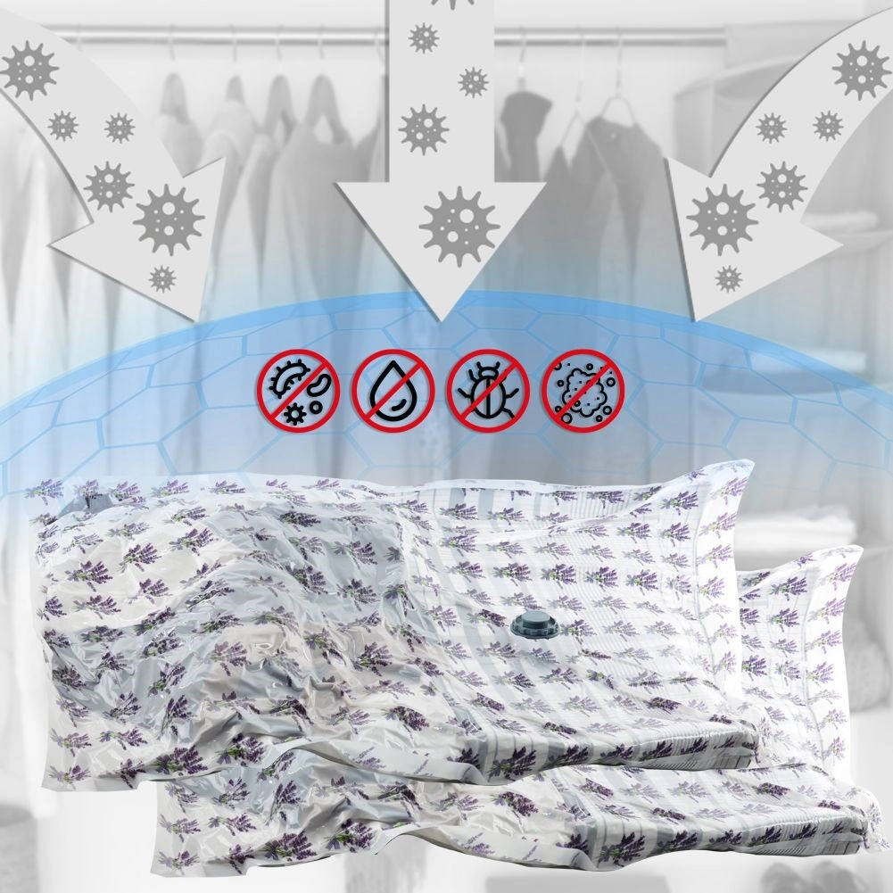 Worek próżniowy to świetne rozwiązanie do sezonowych ubrań, pościeli oraz pluszowych zabawek. Mocna, przezroczysta folia z lawendowym motywem i delikatnym zapachem zapewnia długotrwałą ochronę przed kurzem, brudem, wilgocią i szkodnikami. Dzięki usunięciu nadmiaru powietrza zyskasz przejrzystą i kompaktową przestrzeń do przechowywania.
