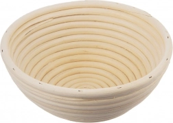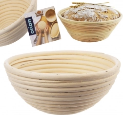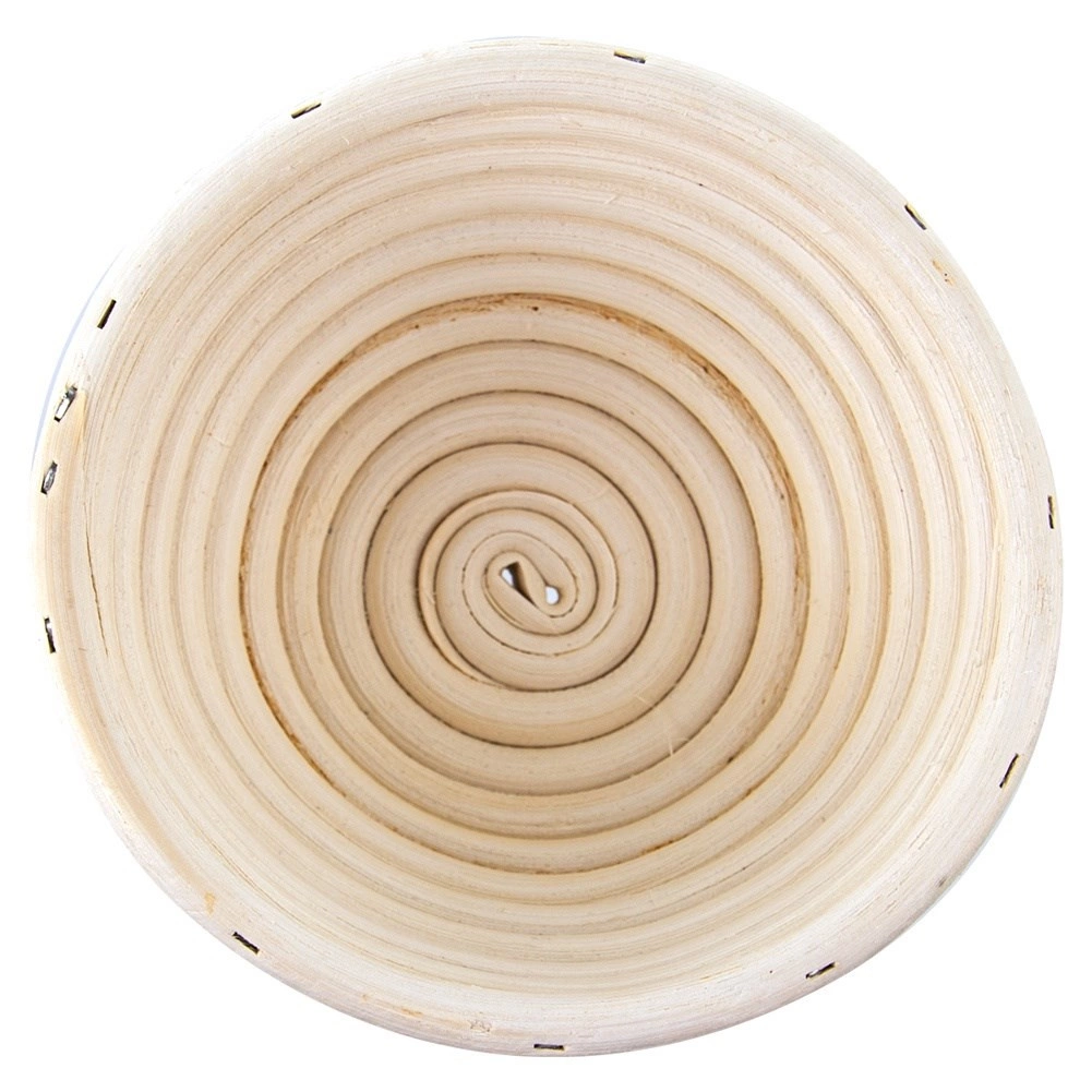 Okrągły rattanowy koszyk do chleba o średnicy 19 cm na bochenek ok. 0,7 kg zapewnia prawidłowe wyrastanie, stabilny kształt i dekoracyjny spiralny wzór na skórce. Wykonany z naturalnego rattanu, odpowiedni do domowego i profesjonalnego wypieku.