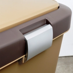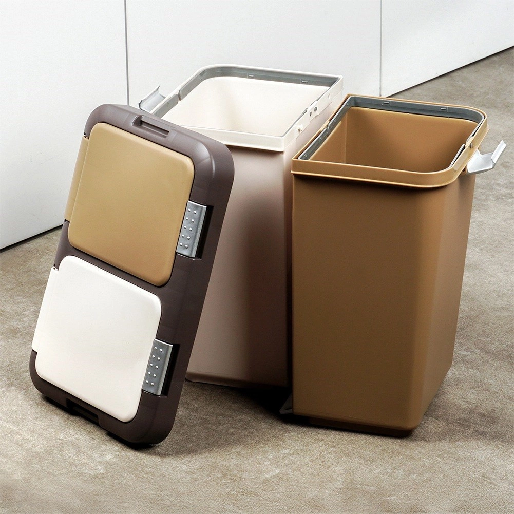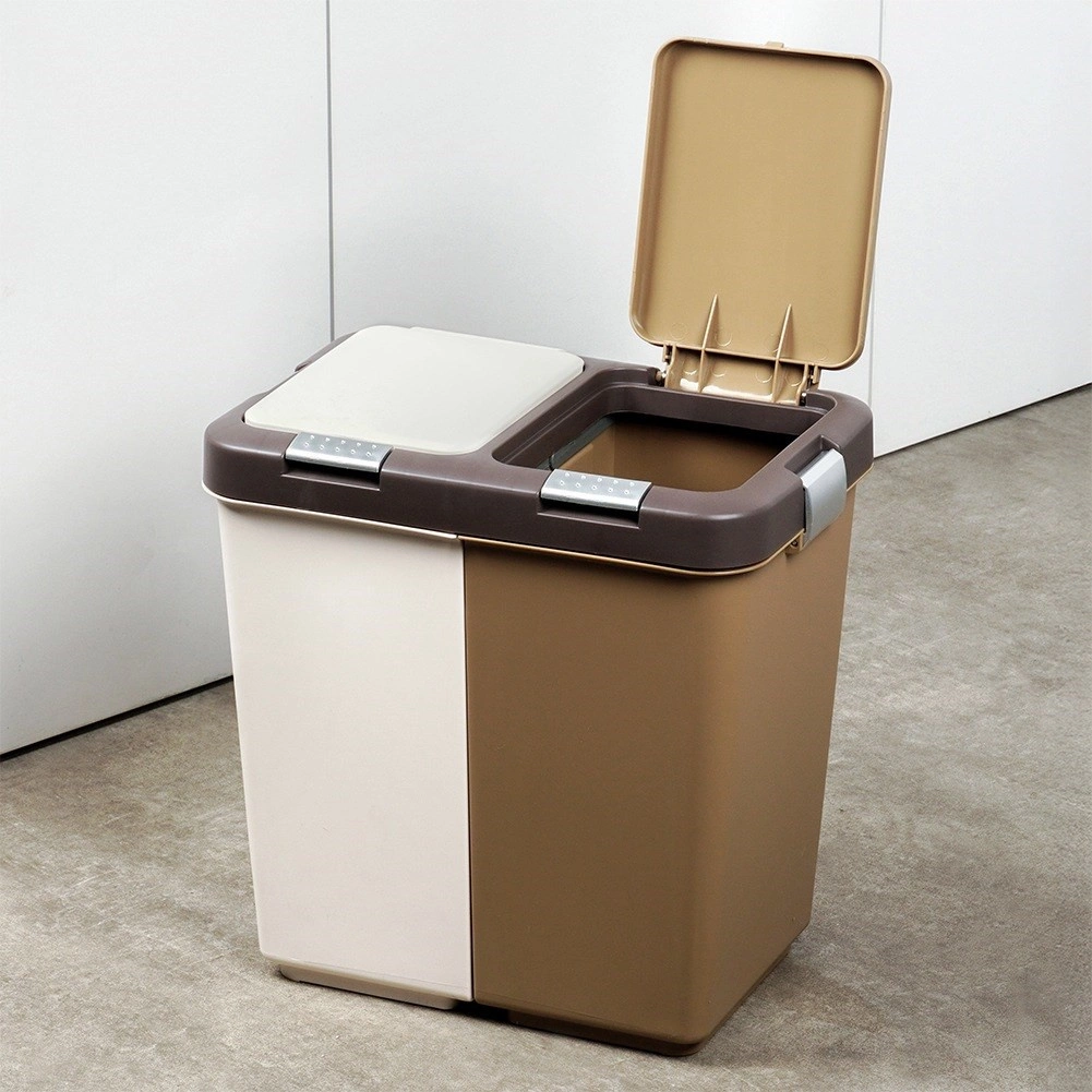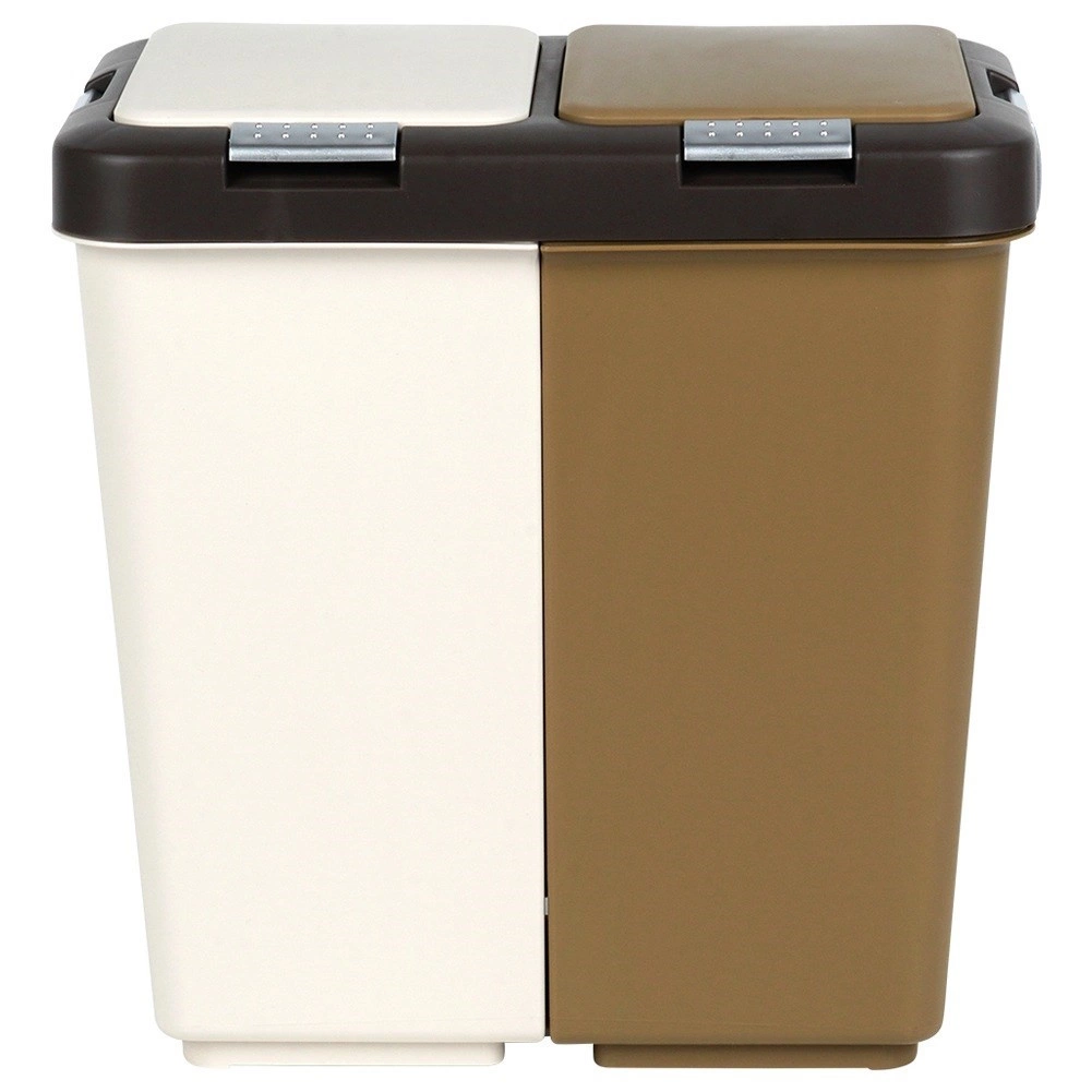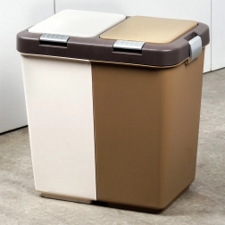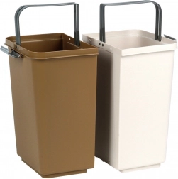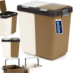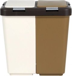 Kosz wykonano z wytrzymałego plastiku w połączeniu bieli i brązu, pasuje do nowoczesnych i mniejszych przestrzeni. Kompaktowe wymiary oszczędzają miejsce bardziej niż dwa oddzielne kosze, a jednocześnie ograniczają rozprzestrzenianie się zapachów dzięki zamykanym pokrywom.