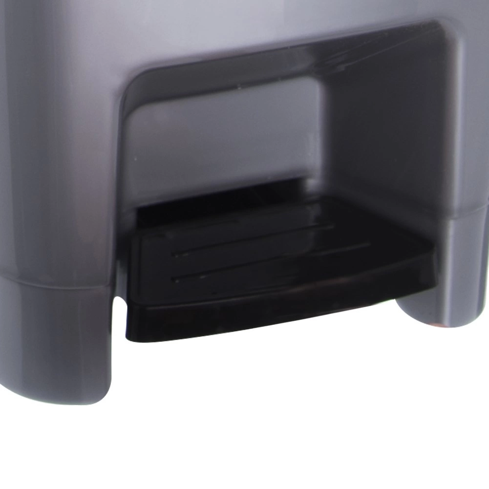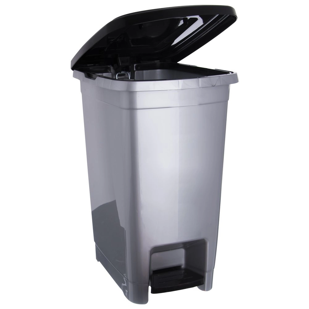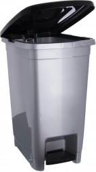 Kosz wykonano z trwałego plastiku w eleganckim szarym kolorze, pokrywa i pedał są czarne. Wewnątrz znajduje się odchylana rama, która pewnie trzyma worek na odpady, więc nie zsuwa się, a wymiana jest łatwa. Dobrze przylegająca pokrywa skutecznie ogranicza rozprzestrzenianie się zapachów. Smukły korpus kosza oszczędza miejsce, a ustawienie kilku koszy obok siebie pozwala na segregację odpadów.