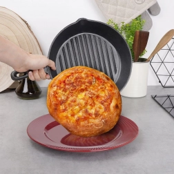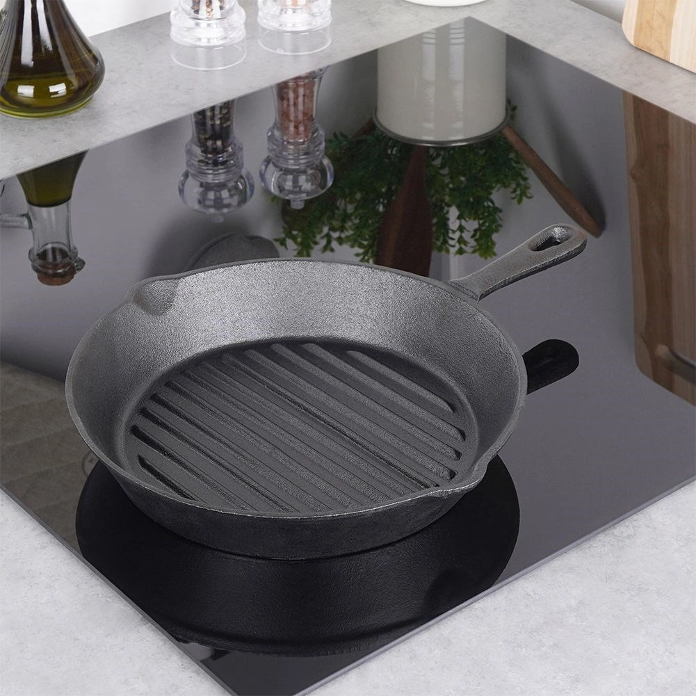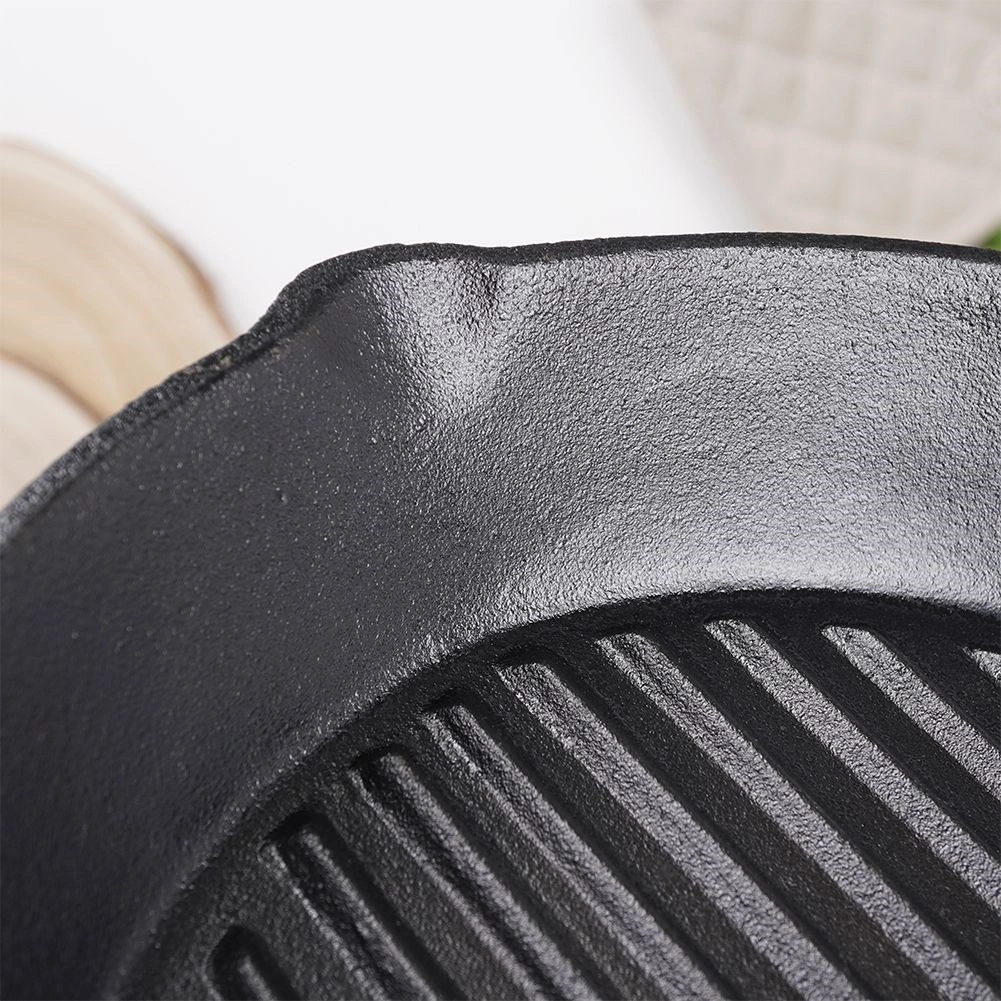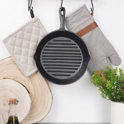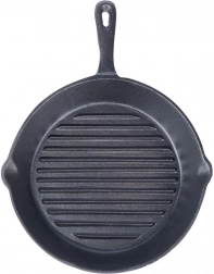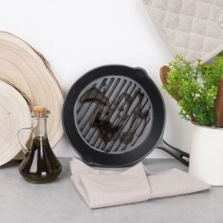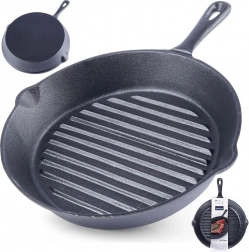 Ta żeliwna patelnia grillowa 24 cm jest idealna do intensywnego smażenia, pieczenia i grillowania. Ciężkie żeliwo równomiernie się nagrzewa i długo utrzymuje temperaturę, dzięki czemu potrawy pozostają dłużej ciepłe i soczyste. Wewnętrzna ryflowana powierzchnia odprowadza nadmiar tłuszczu i tworzy atrakcyjny odcisk grillowy.