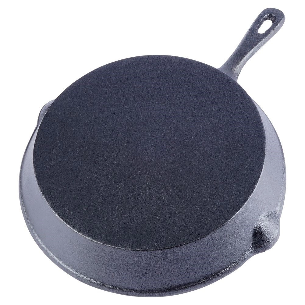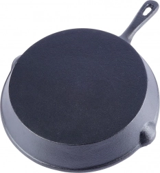 Patelnia jest uniwersalna – nadaje się na gaz, elektrykę, płytę ceramiczną, halogen oraz indukcję, a także do piekarnika czy bezpośrednio na grill lub otwarty ogień. Praktyczne dwie wylewki i wygodne ucho ułatwiają manipulację i serwowanie.