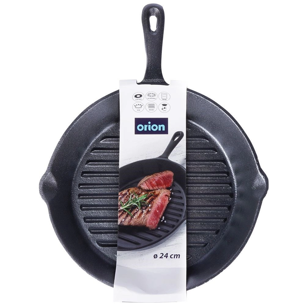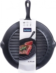 Solidna żeliwna patelnia grillowa o średnicy 24 cm do perfekcyjnie przypieczonych steków, warzyw i ziemniaków. Dzięki masywnej konstrukcji doskonale akumuluje ciepło, tworzy wyraziste ślady rusztu i nadaje się do wszystkich typów kuchenek, w tym indukcji, oraz do piekarnika. Dwustopniowe wylewki ułatwiają zlewanie soków, wysoka odporność na temperaturę zapewnia długą żywotność, a uniwersalne zastosowanie docenisz w domu i na grillu czy przy ognisku.