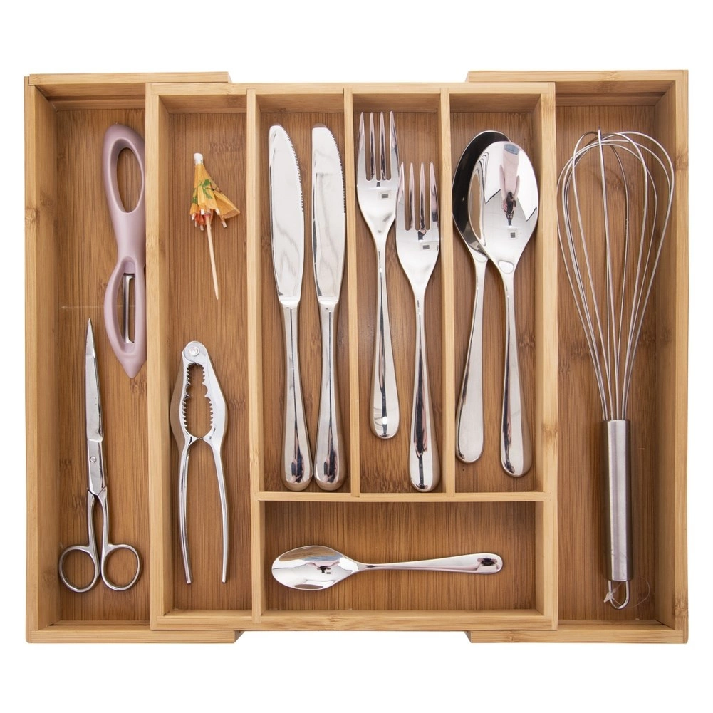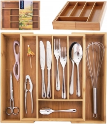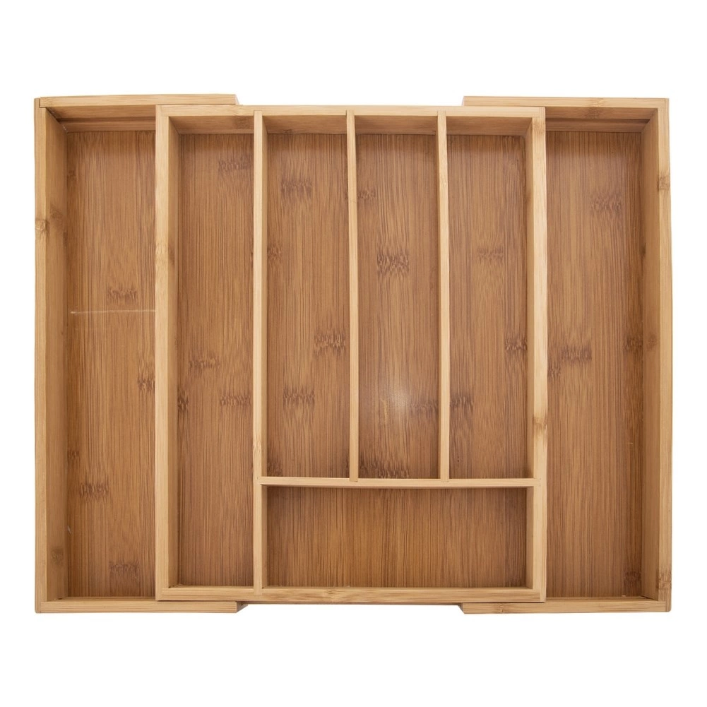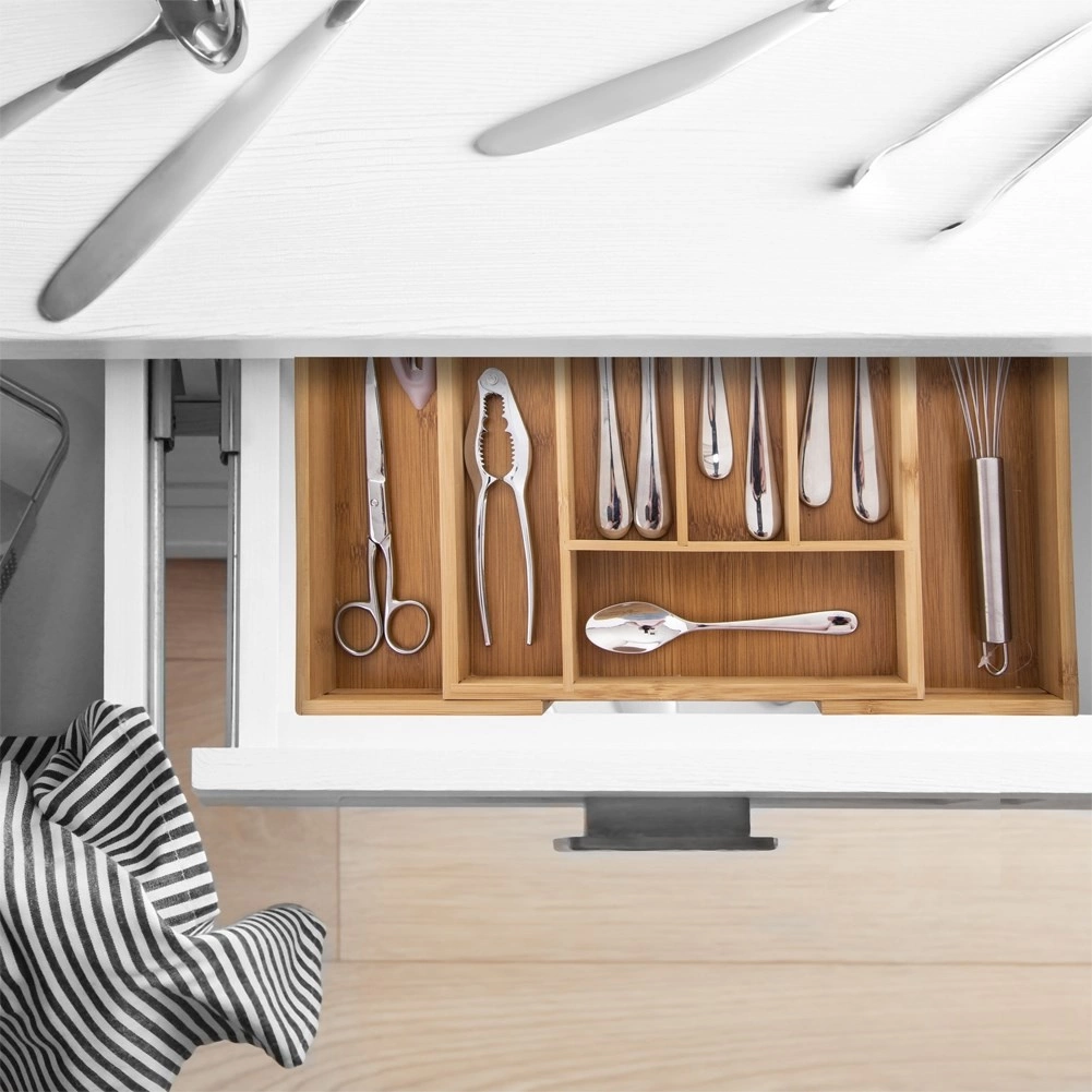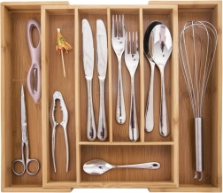 Utrzymuj porządek w kuchni dzięki temu bambusowemu, rozsuwanemu organizerowi do szuflady. Dzięki regulowanej szerokości 26–40 cm idealnie dopasuje się do większości szuflad. Oferuje 5–7 przejrzystych przegródek na sztućce, noże i akcesoria kuchenne. Naturalny bambus jest trwały, szybko schnie i nie pochłania zapachów.