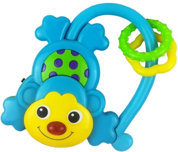 Dziecięca grzechotka Baby Mix w kształcie uroczej małpki łączy zabawę z rozwojem umiejętności. Po naciśnięciu przycisku grzechotka odtwarza melodię i świeci, dzięki czemu w naturalny sposób stymuluje wzrok i słuch. Kolorowe elementy, lusterko i fakturowane gryzaki zapewniają maluszkowi zabawę oraz ulgę podczas ząbkowania.