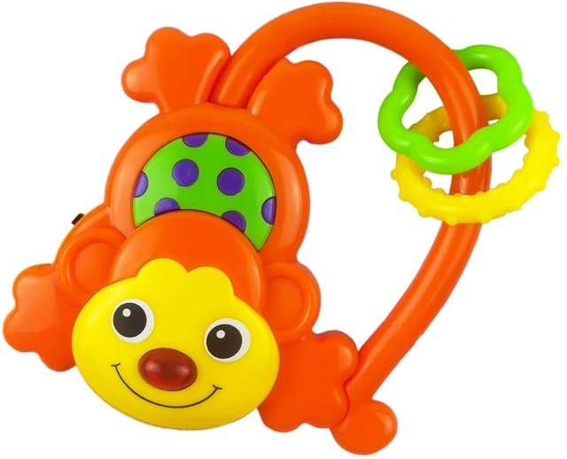 Wesoła grzechotka w kształcie małpki od Baby Mix ucieszy maluszki od pierwszych dni życia. Oferuje melodię po naciśnięciu przycisku, efekty świetlne, zintegrowane gryzaki oraz bezpieczne lusterko. Dzięki ergonomicznemu kształtowi łatwo się ją trzyma, wspiera rozwój zmysłów i motoryki i jest wykonana z trwałych, łatwych do mycia materiałów.