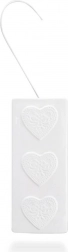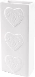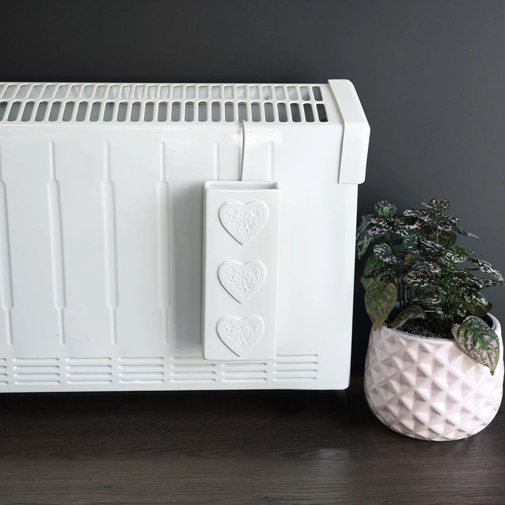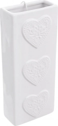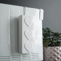 Wykonany z wysokiej jakości ceramiki w białym kolorze z błyszczącym szkliwem oraz trzema wypukłymi serduszkami na froncie. Wąska i wysoka forma oszczędza miejsce i umożliwia wygodne zawieszenie na większości standardowych grzejników bez użycia narzędzi.