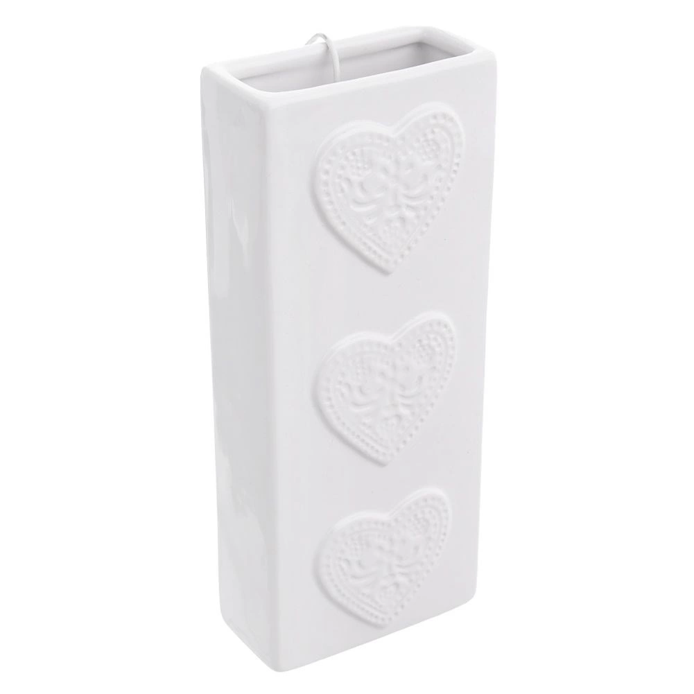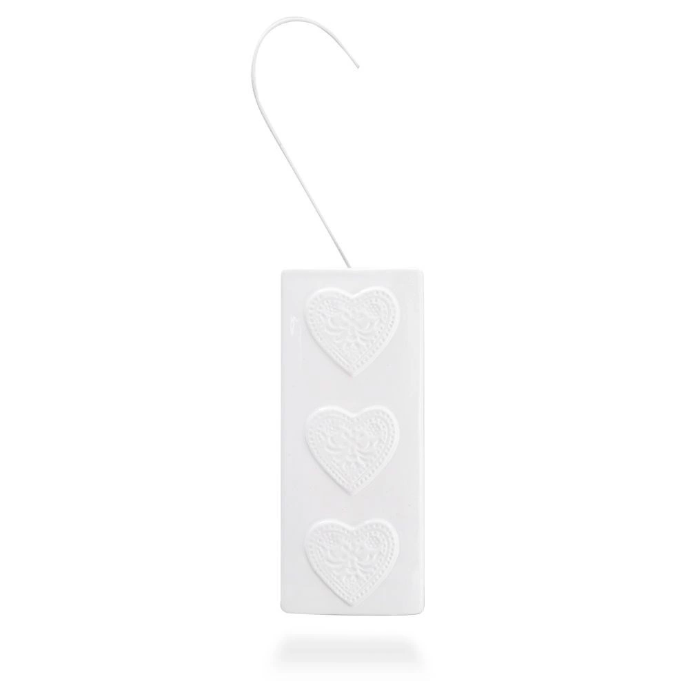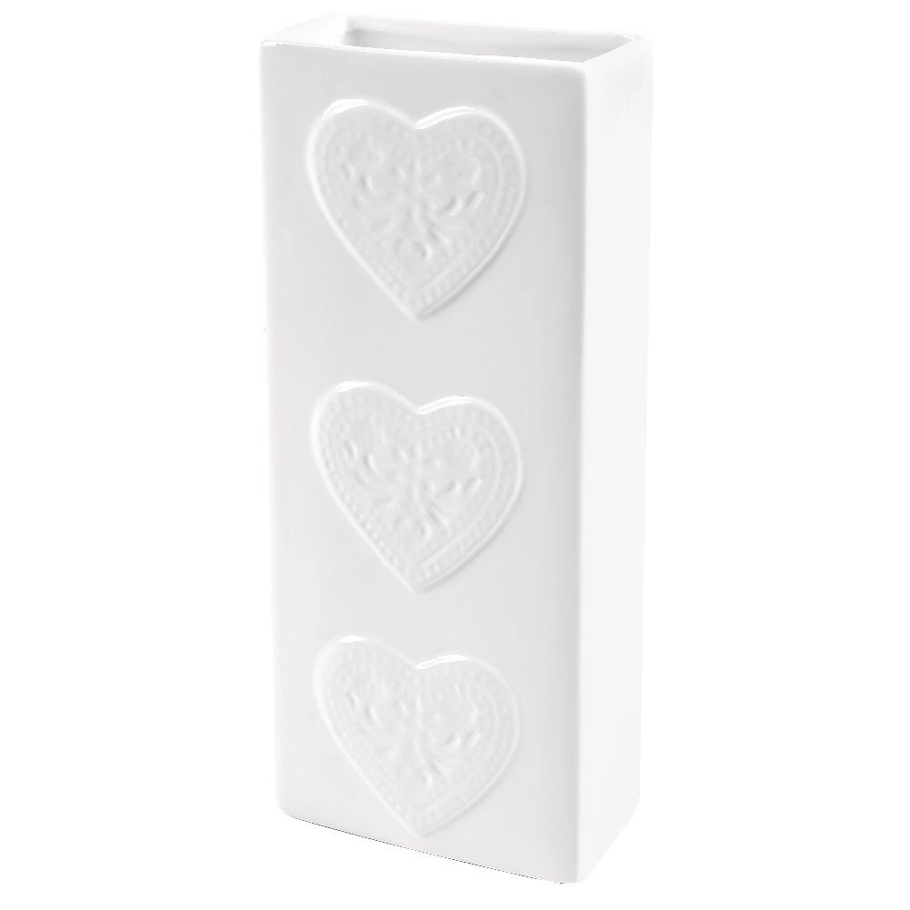 Biała szkliwiona ceramika z tłoczonymi sercami prezentuje się elegancko i pasuje zarówno do nowoczesnych, jak i klasycznych wnętrz.