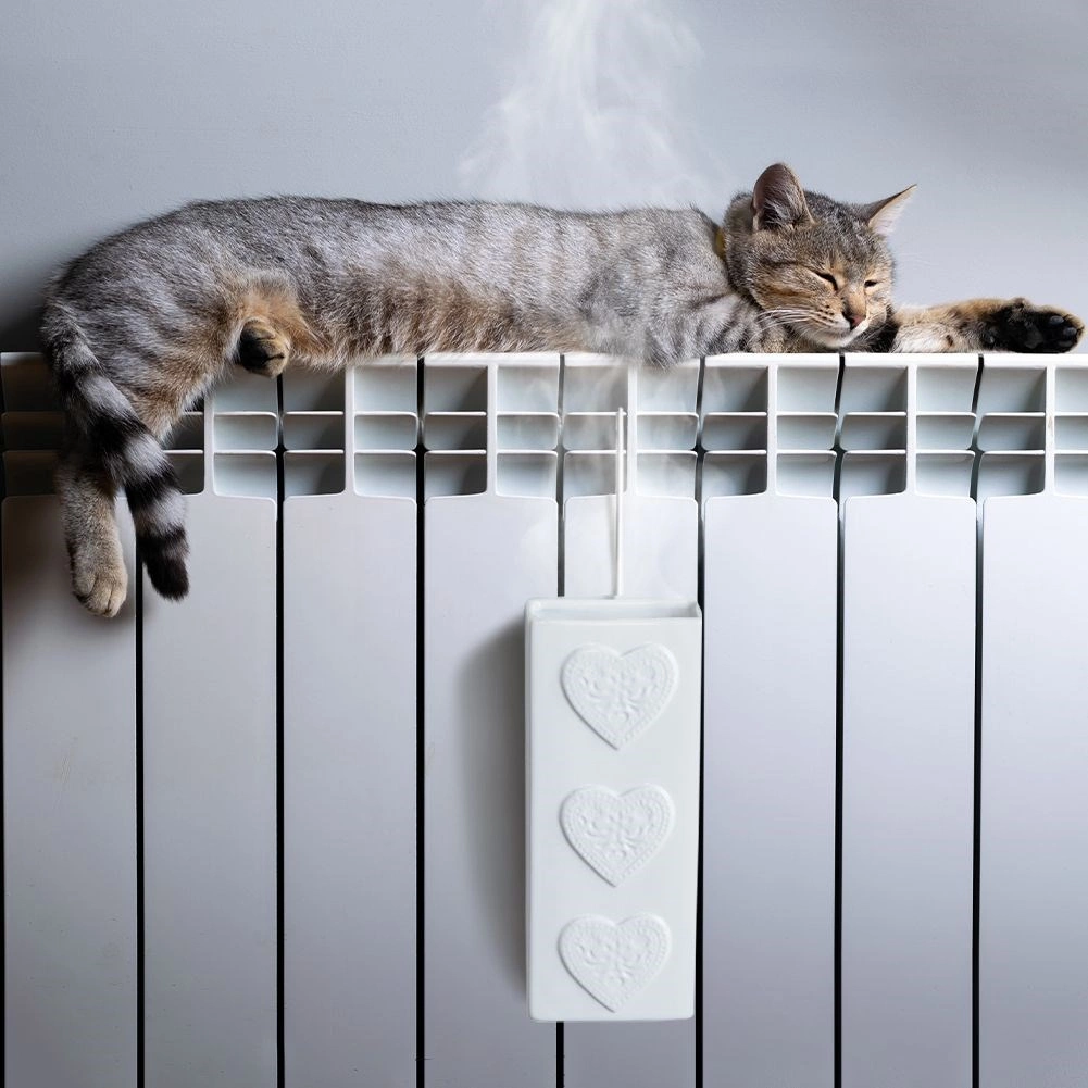 Metalowy haczyk umożliwia szybkie zamocowanie na większości grzejników. Wystarczy napełnić wodą i zawiesić – nawilżanie rozpocznie się natychmiast pod wpływem ciepła grzejnika.