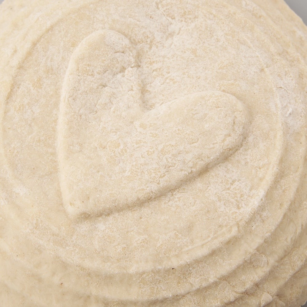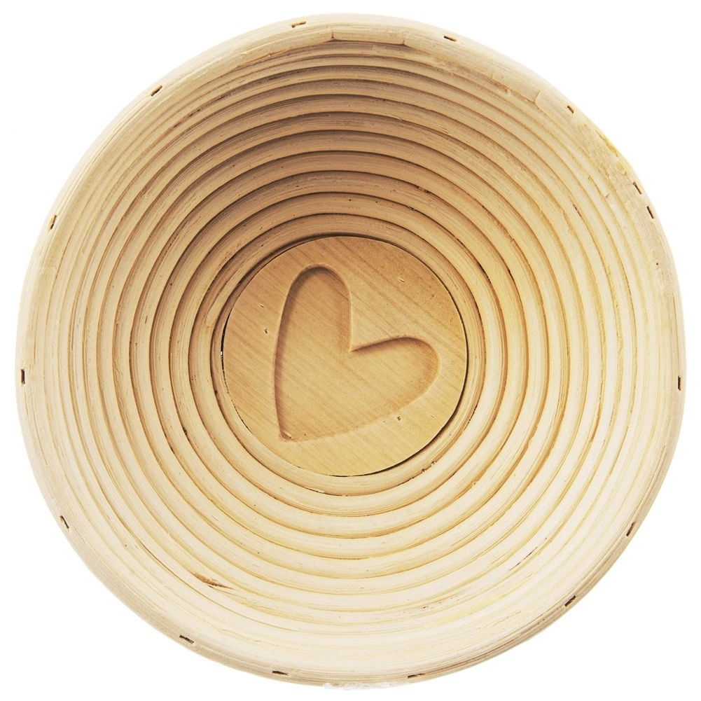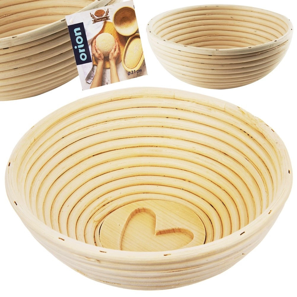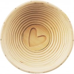 Okrągły rattanowy koszyk o średnicy 21 cm z dekoracyjnym sercem pomoże Twojemu ciastu pięknie wyrosnąć i zachować kształt tradycyjnego bochenka. Z naturalnego rattanu w beżowym kolorze, zapewnia równomierne wyrastanie i typowe spiralne wzory. Idealny na bochenek ok. 1,2 kg (ok. 600 g mąki), świetny do domowego i profesjonalnego pieczenia.