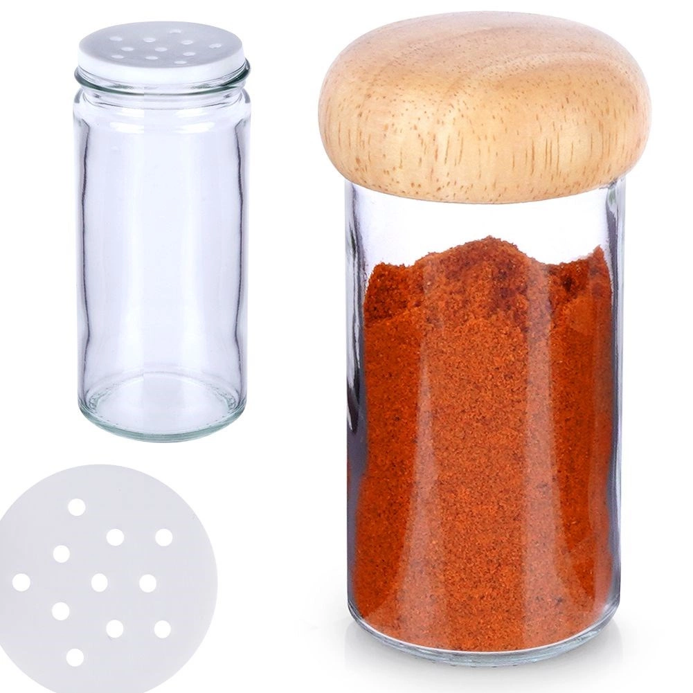 Ten szklany pojemnik na przyprawy z sitkiem łączy elegancki wygląd z wysoką funkcjonalnością. Przezroczyste szkło ułatwia kontrolę ilości, zdejmowane sitko zapewnia wygodne i równomierne dozowanie, a drewniana zakręcana pokrywka chroni zawartość przed wilgocią i utrzymuje świeżość aromatów.