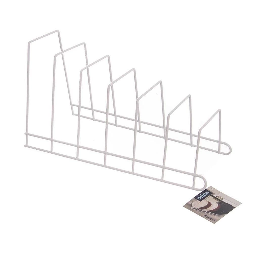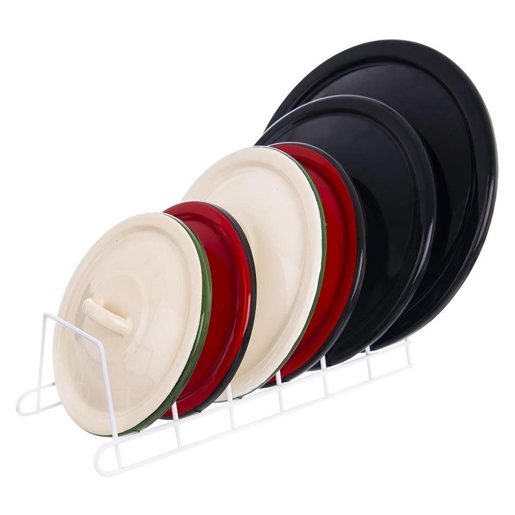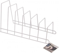 Praktyczny metalowy organizer kuchenny do pionowego przechowywania do 6 sztuk – pokrywek, talerzy lub desek do krojenia. Stabilna druciana konstrukcja w białym kolorze oszczędza miejsce w szafkach i szufladach, zapewnia porządek i chroni pokrywki przed zarysowaniami. Łatwy w czyszczeniu, świetnie pasuje do nowoczesnych i klasycznych kuchni.
