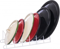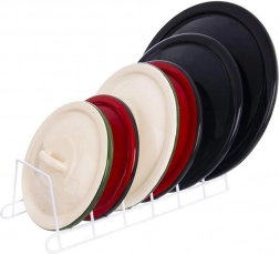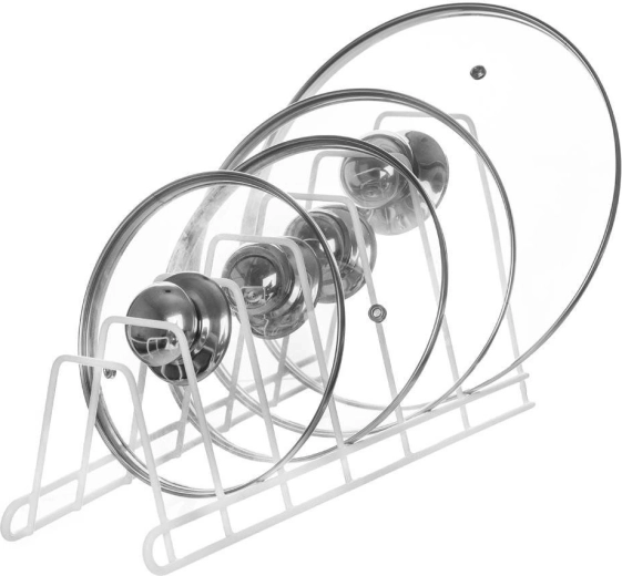 Stojak nadaje się do różnych rozmiarów i typów – od pokrywek z uchwytem po płytkie talerze i deski do krojenia, do szafki i na blat.