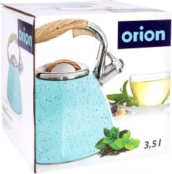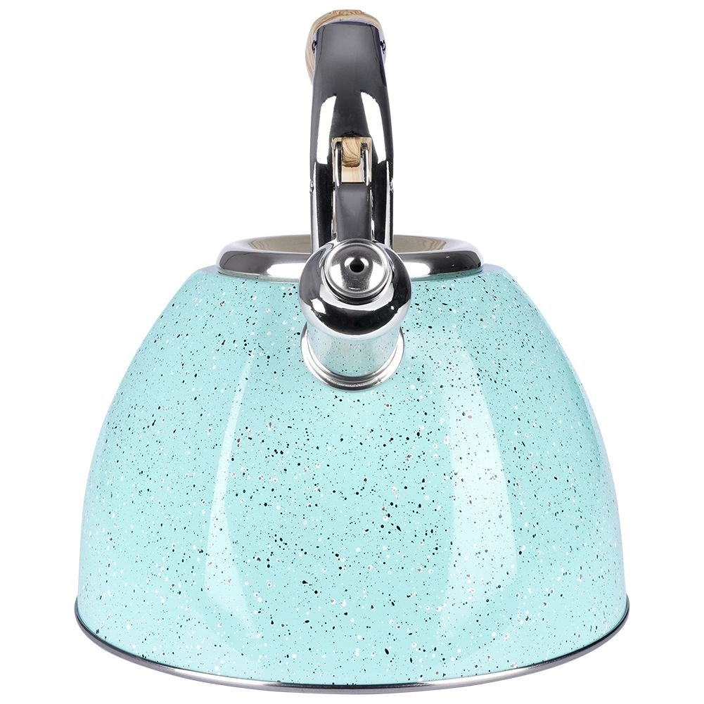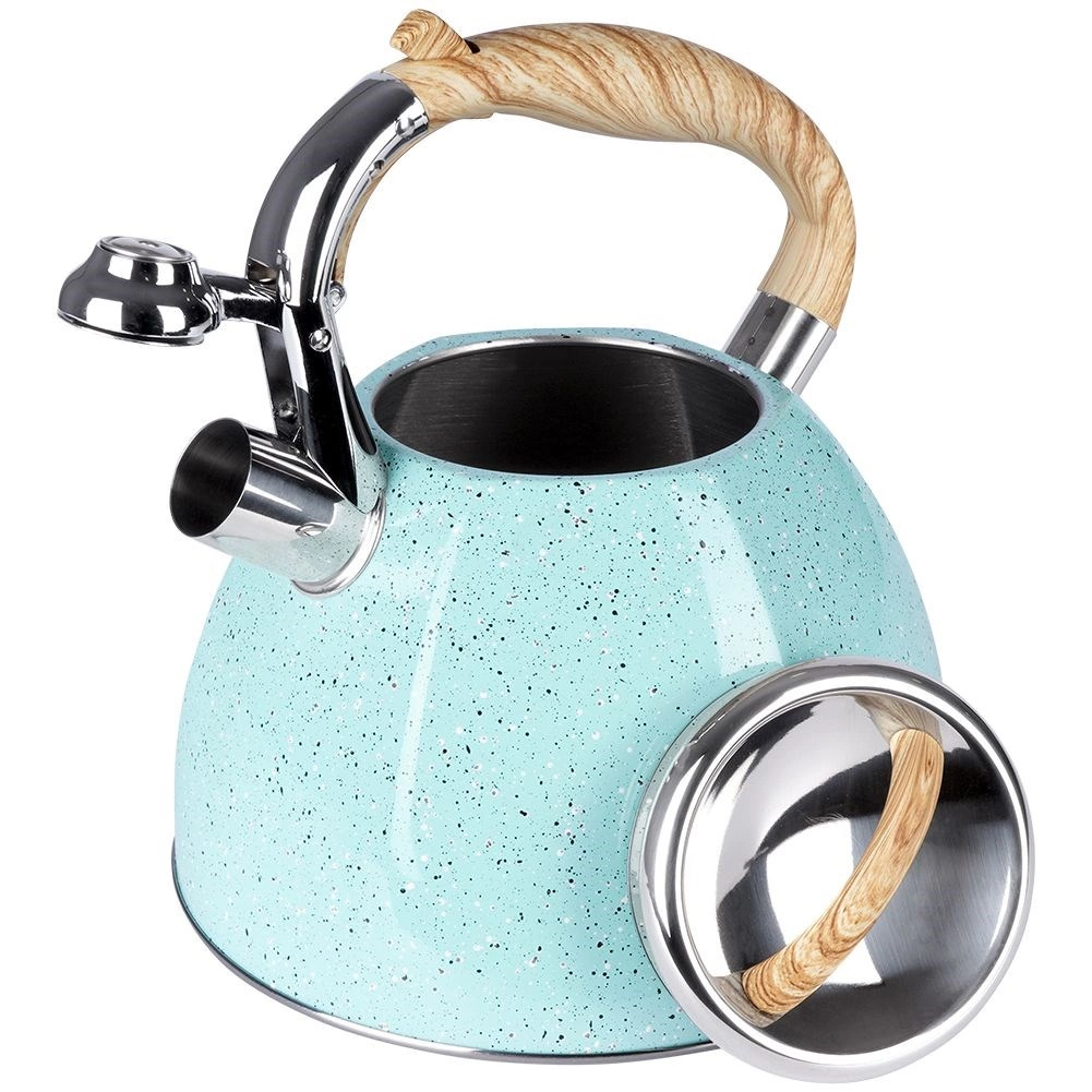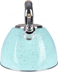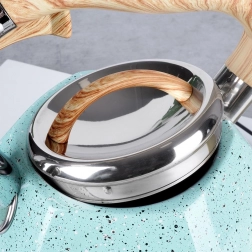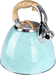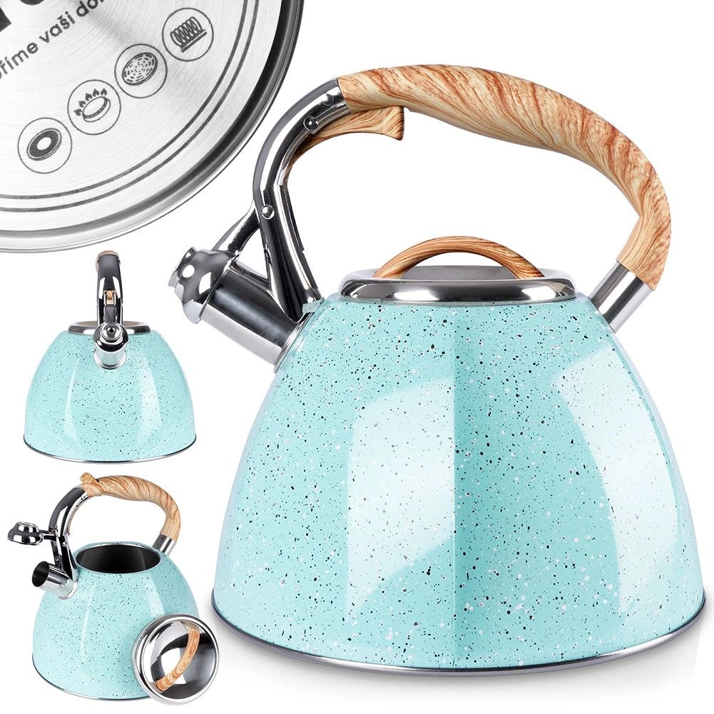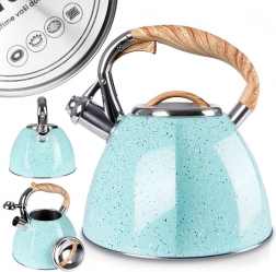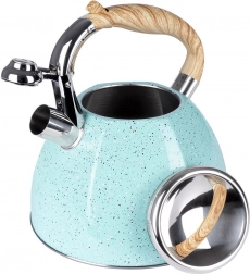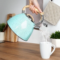 Stylowy czajnik z stali nierdzewnej z emaliowaną, niebieską powierzchnią, gwizdkiem i nienagrzewającym się uchwytem w dekorze drewna. Odpowiedni na wszystkie typy kuchenek, w tym indukcję, użytkowa pojemność 3 l (całkowita 3,5 l). Wygodne nalewanie dzięki przyciskowi do automatycznego otwierania wylewki oraz szerokiej pokrywie ułatwiającej napełnianie i czyszczenie.