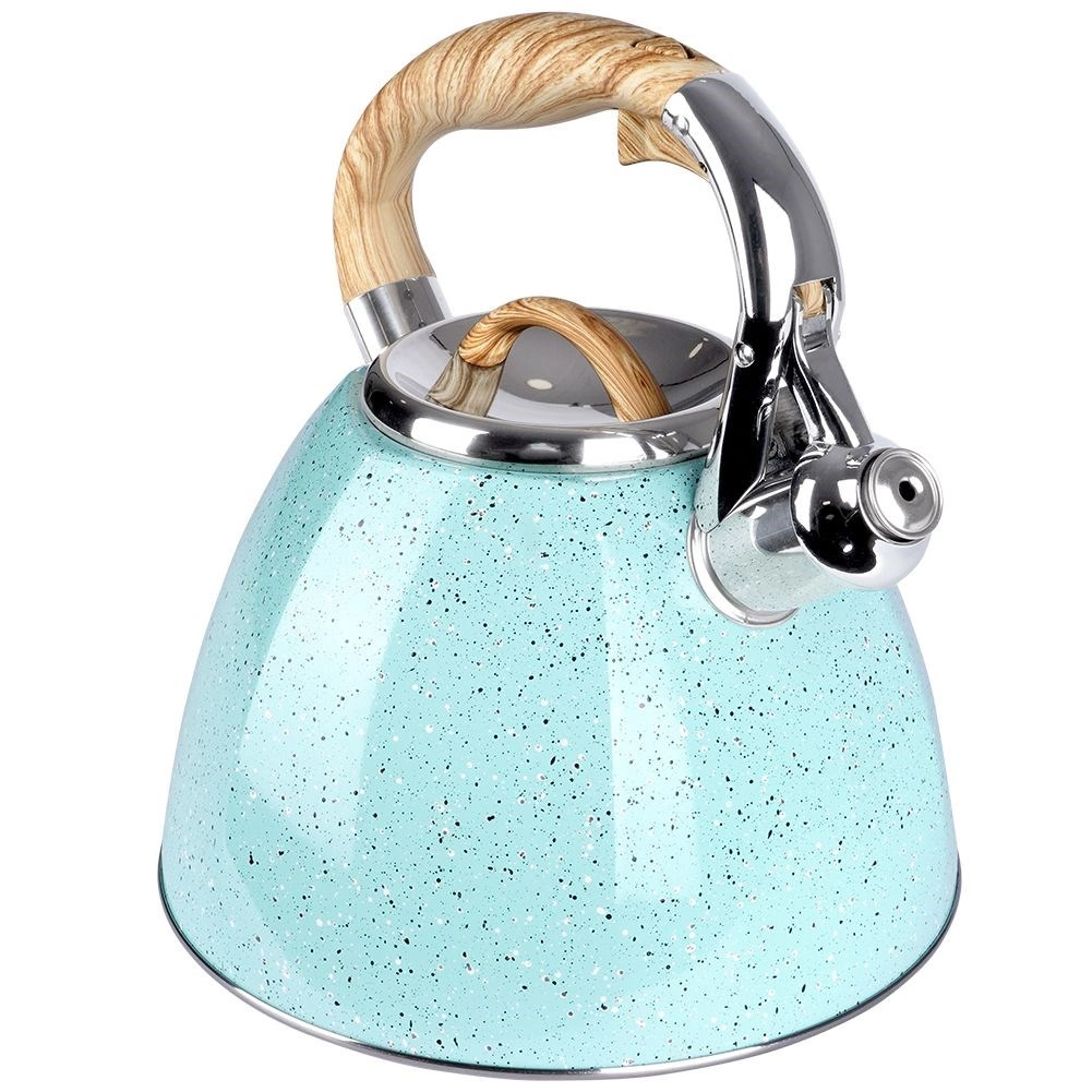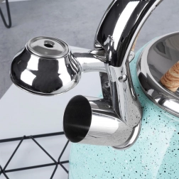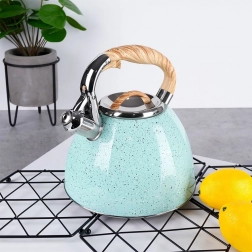 Ten elegancki czajnik łączy nowoczesny design z praktycznością do codziennego użytku. Wytrzymały korpus ze stali nierdzewnej z emaliowaną powierzchnią w popularnym niebieskim kolorze zapewnia szybkie i równomierne podgrzewanie wody, a gwizdek niezawodnie sygnalizuje wrzenie. Ergonomiczny uchwyt w efekcie drewna nie nagrzewa się i wygodnie leży w dłoni.