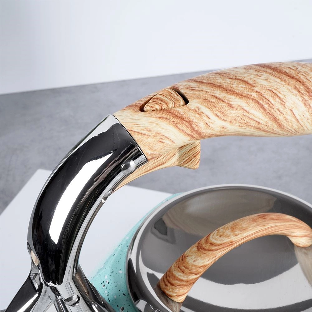 Ergonomiczny uchwyt z imitacją drewna nie nagrzewa się, a dzięki przyciskowi w rękojeści automatycznie otwiera wylewkę z gwizdkiem, co zapewnia wygodne i bezpieczne nalewanie.
