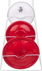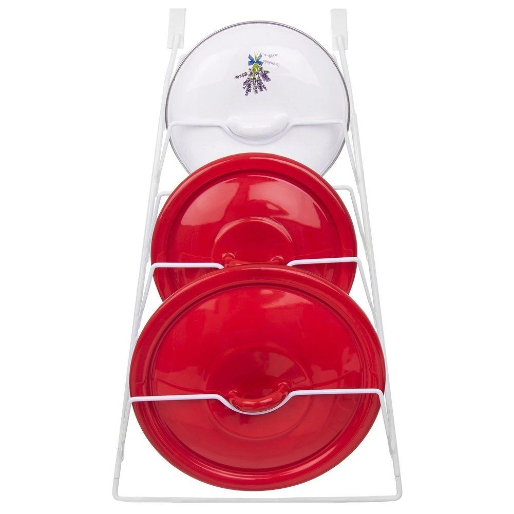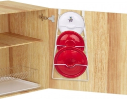 Ten kuchenny organizer w formie wiszącego wieszaka pomieści aż 6 pokrywek o różnych rozmiarach. Montaż bez wiercenia – wystarczy zawiesić go na drzwiczkach szafki. Dzięki przemyślanej konstrukcji pokrywki są przejrzyście ułożone, łatwo dostępne i chronione przed uszkodzeniem.