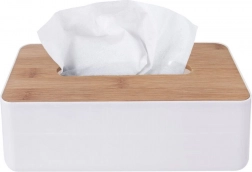 Elegancki pojemnik na chusteczki łączący biały plastik i naturalny bambus do nowoczesnych wnętrz. Oferuje praktyczne i higieniczne dozowanie, jest trwały i lekki, ma łatwą obsługę i służy także jako stylowa dekoracja do łazienki, sypialni, salonu czy biura.