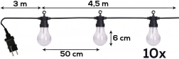 - 10 żarówek LED o średnicy ok. 6 cm, odstępy między żarówkami ok. 50 cm.