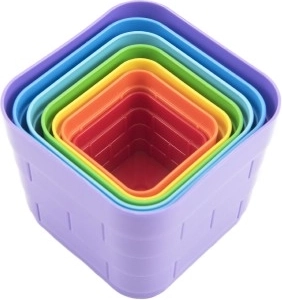 Wytrzymały plastik bez ostrych krawędzi nadaje się do zabawy w domu i na zewnątrz – klocki można zabrać do piasku lub do wody. Elementy łatwo się wkładają jeden w drugi, dzięki czemu zestaw nie zajmuje dużo miejsca i jest prosty w przechowywaniu.
