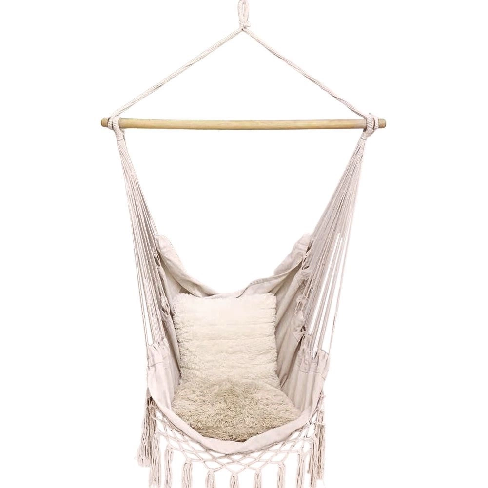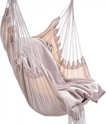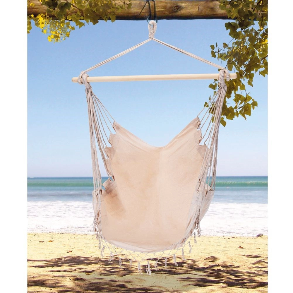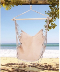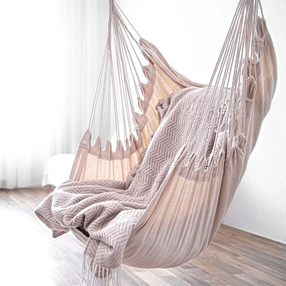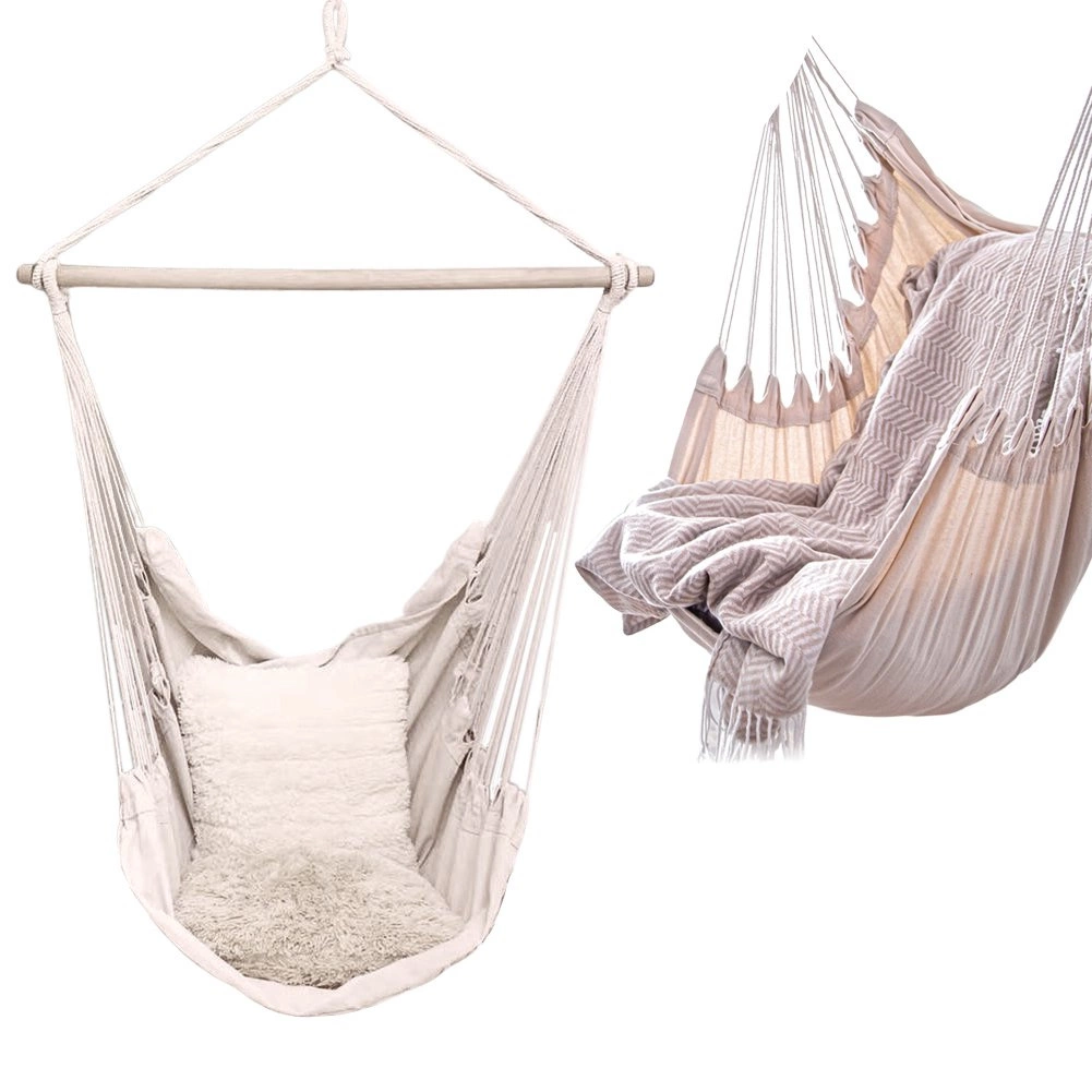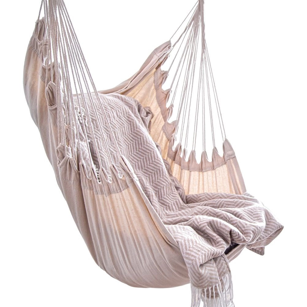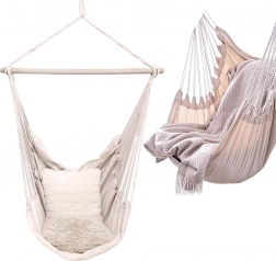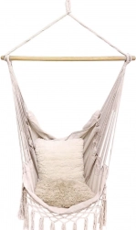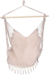 Elegancki fotel podwieszany hamak w beżowym kolorze to świetny wybór do ogrodu, na balkon, taras oraz do wnętrz. Dzięki jednemu punktowi podwieszenia oszczędza miejsce i tworzy przytulny kącik do czytania i leniuchowania. Solidna konstrukcja ze stabilizującą drewnianą poprzeczką zapewnia wygodne siedzenie i bezpieczne bujanie.