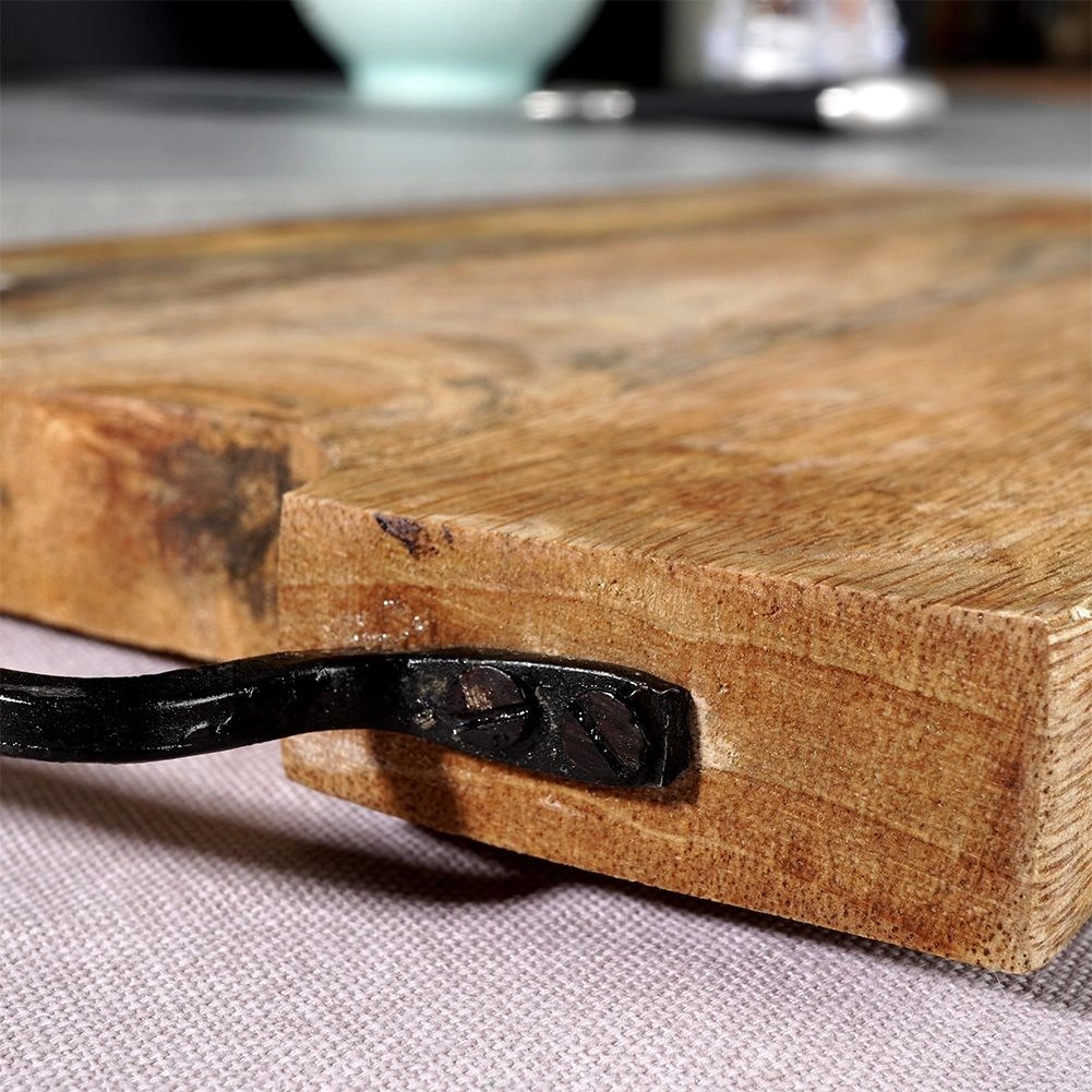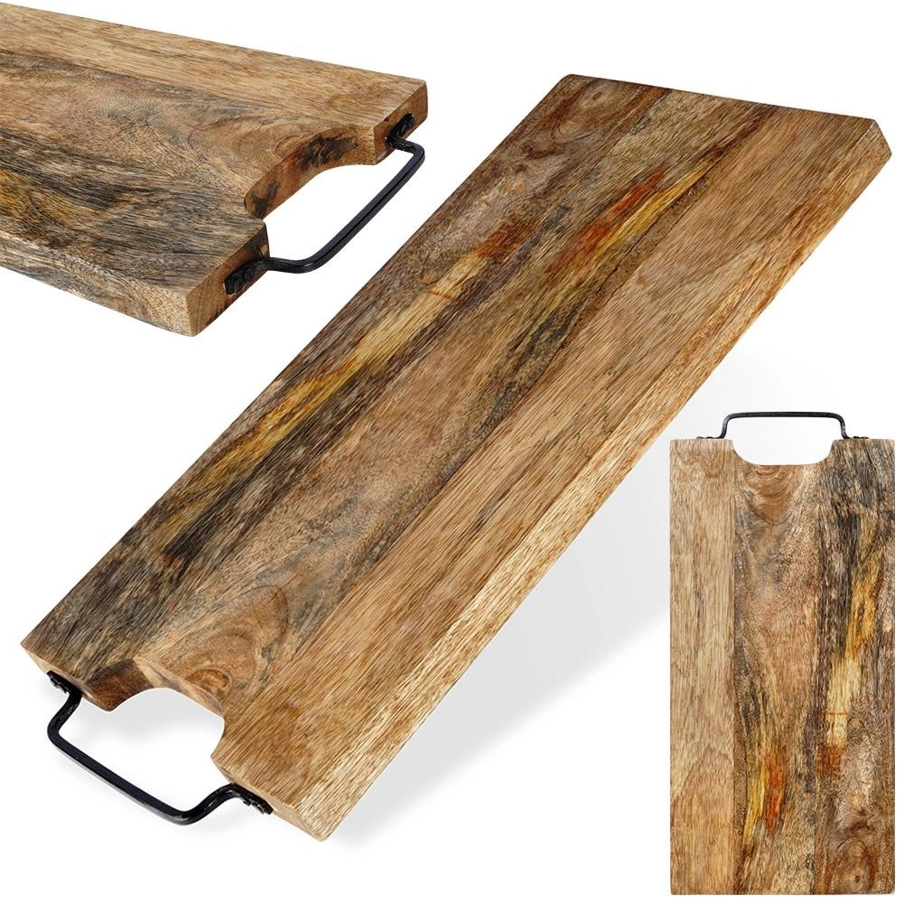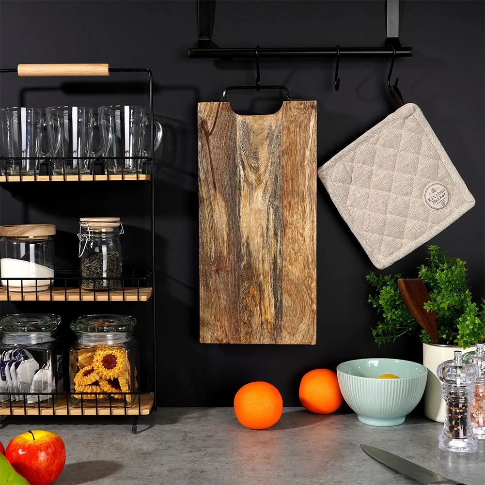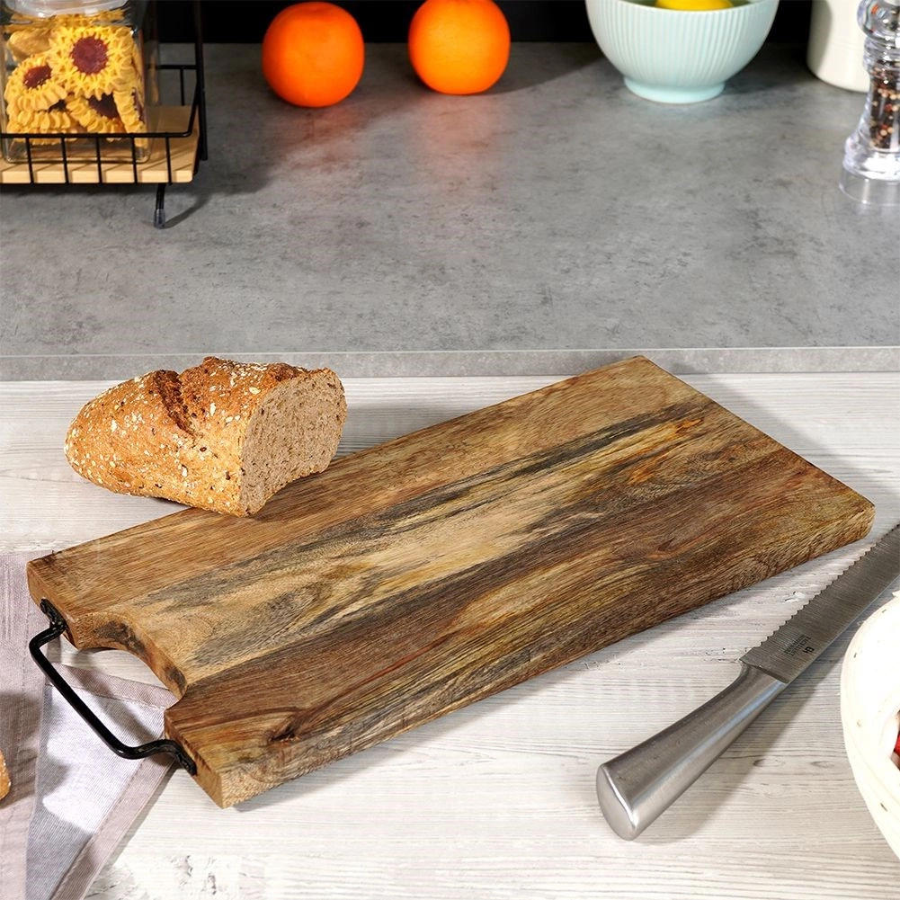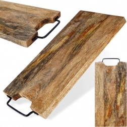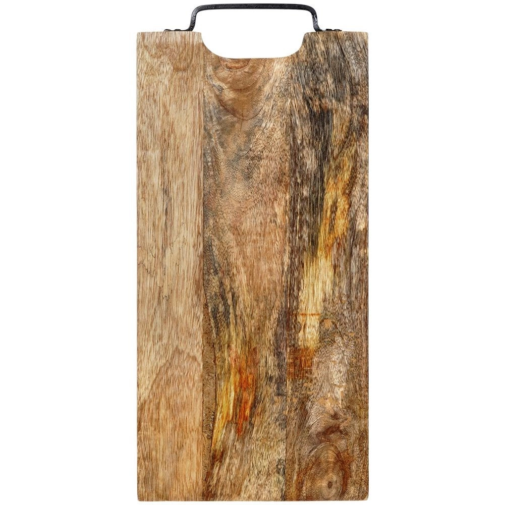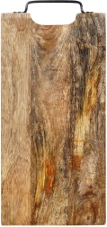 Solidna drewniana deska z drewna mango o wymiarach 44 × 19 cm i grubości 2 cm jest idealna do krojenia i serwowania. Ma dużą powierzchnię roboczą, praktyczny metalowy uchwyt do łatwego przenoszenia lub zawieszenia oraz naturalnie odporną powierzchnię, która nie wchłania zapachów i szybko schnie. Stylowy, lekko industrialny charakter podkreśla czarny metalowy uchwyt.