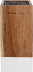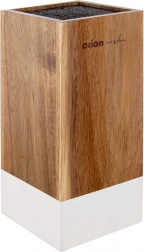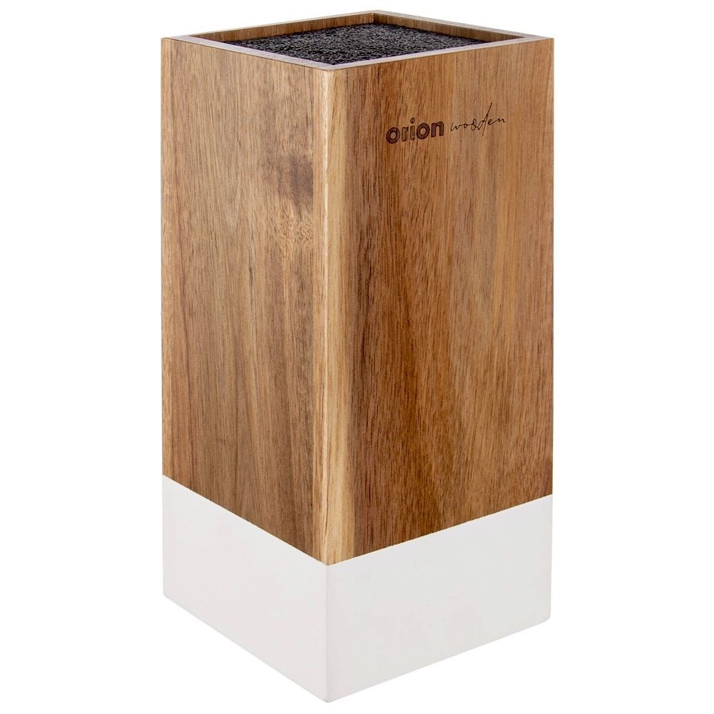 Praktyczny i designerski blok na noże Whiteline wykonany jest z wysokiej jakości drewna akacjowego i uzupełniony białym dekoracyjnym paskiem. Dzięki gęstemu wyjmowanemu plastikowemu włosiu bezpiecznie przechowasz noże stalowe, ceramiczne i łączone bez ryzyka ich tępienia. Kompaktowy kształt oszczędza miejsce na blacie i utrzymuje Twoje kuchenne akcesoria zawsze pod ręką.