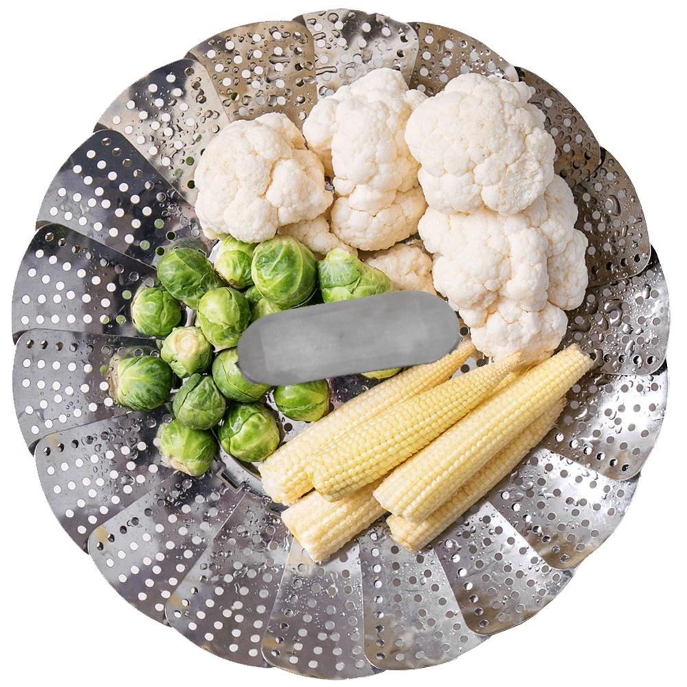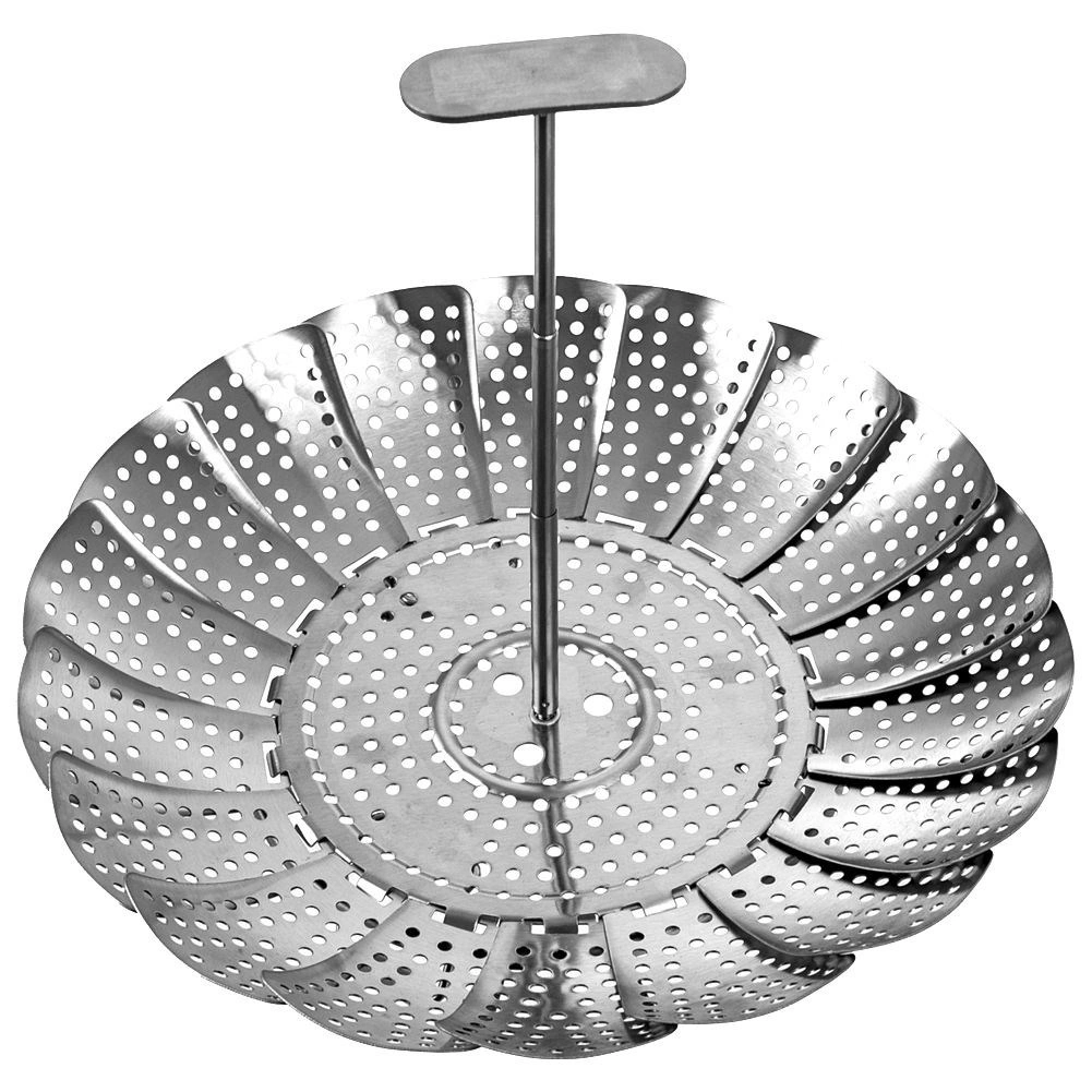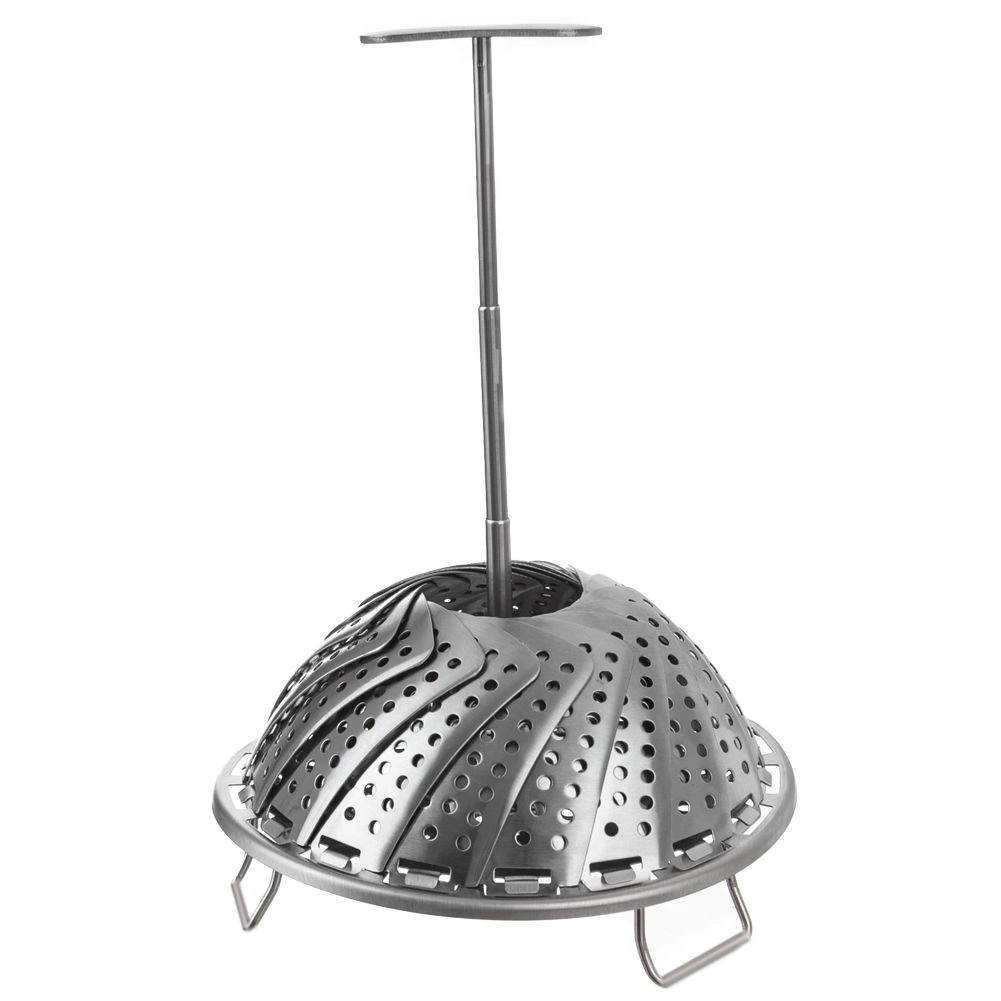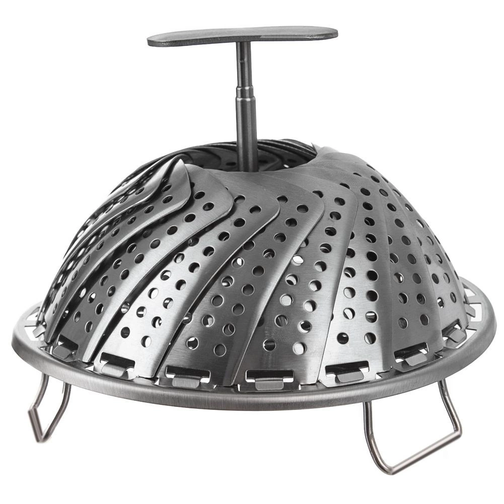 Praktyczny składany parownik z wysokiej jakości stali nierdzewnej jest idealny do przygotowywania potraw na parze. Rozsuwana średnica 14–23 cm umożliwia użycie w garnkach o różnej wielkości, a perforowane „listki” zapewniają równomierną cyrkulację pary i delikatną obróbkę żywności.