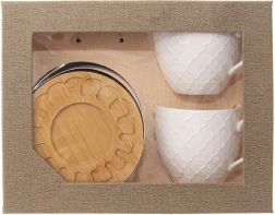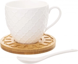 Udoskonal swój kącik kawowy stylowym zestawem, który łączy czystą białą porcelanę i naturalny bambus. Filiżanki z eleganckim reliefem pięknie uzupełnią każdą zastawę stołową, a dzięki wygodnemu uchu są bardzo poręczne. Zestaw jest praktyczny do codziennego użytku, a jednocześnie reprezentacyjny na uroczyste chwile.