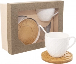 Elegancki zestaw dwóch porcelanowych filiżanek z bambusowymi spodkami i łyżeczkami jest idealny do kawy i herbaty. Filiżanki o pojemności 250 ml mają stylowe, reliefowe zdobienie, wygodne ucho dla łatwego trzymania, a w połączeniu z podstawkami z naturalnego bambusa tworzą ponadczasowy komplet. Łyżeczki i filiżanki można myć w zmywarce. Znakomite także jako opakowanie prezentowe marki ORION.