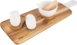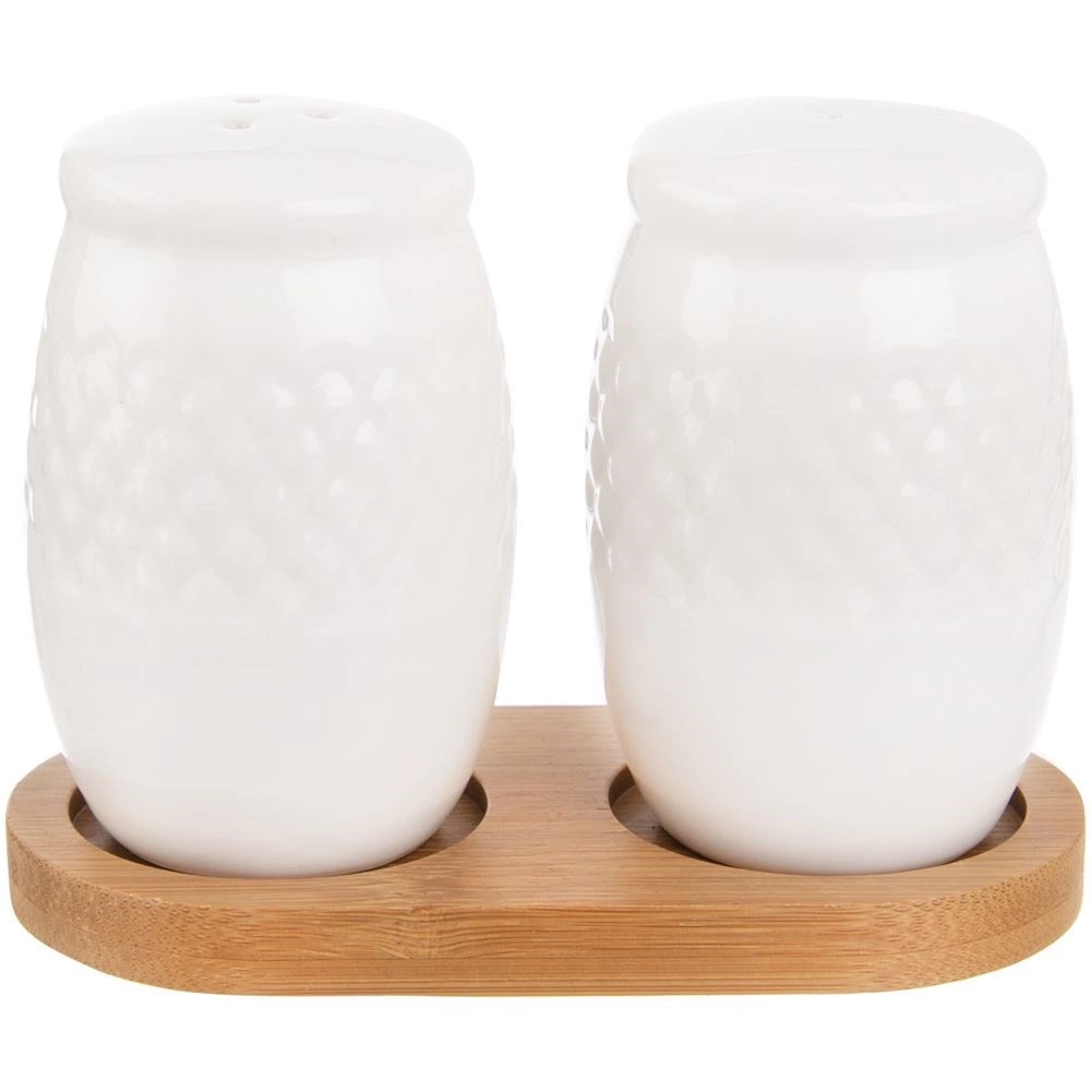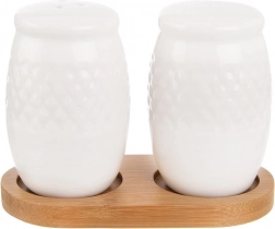 Ten 3‑częściowy zestaw WHITELINE łączy czysty design i funkcjonalność. Dwa białe porcelanowe pojemniki z eleganckim, tłoczonym dekorem osadzone są na solidnej bambusowej podstawce, która pomaga utrzymać porządek na blacie kuchennym i stole jadalnianym. Dzięki dyskretnym otworom dozującym wsypiesz dokładną ilość soli i pieprzu podczas gotowania i serwowania.