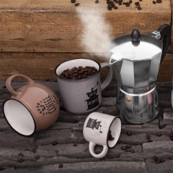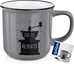 Elegancką szarą powierzchnię uzupełnia czarny nadruk ręcznego młynka oraz napis – kubek ucieszy każdego miłośnika kawy i ozdobi kuchnię lub biuro.