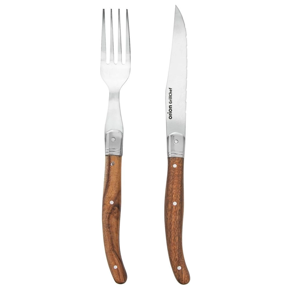 Elegancki zestaw noża do steków i widelca dla jednej osoby z wysokiej jakości stalowym ostrzem ze stali nierdzewnej oraz ergonomicznymi drewnianymi rękojeściami. Idealny do steków, burgerów i grillowania. Nóż z ząbkowanym ostrzem radzi sobie nawet z twardszym mięsem, a rękojeści z drewna akacjowego świetnie leżą w dłoni, zapewniając wygodny i stabilny chwyt.