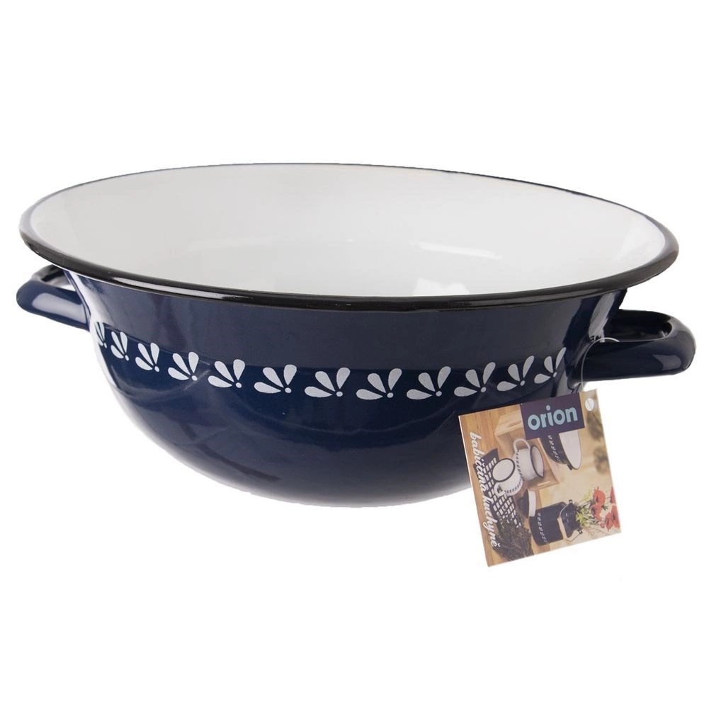 Stylowa niebiesko-biała misa z wysokiej jakości stali emaliowanej o średnicy 26 cm i pojemności 2,5 l z praktycznymi bocznymi uchwytami dla łatwego przenoszenia. Idealna do mieszania ciasta, przygotowywania sałatek oraz serwowania. Wytrzymała emalia jest higieniczna i odpowiednia także dla alergików, powierzchnia łatwa w czyszczeniu i odpowiednia do zmywarki.