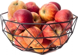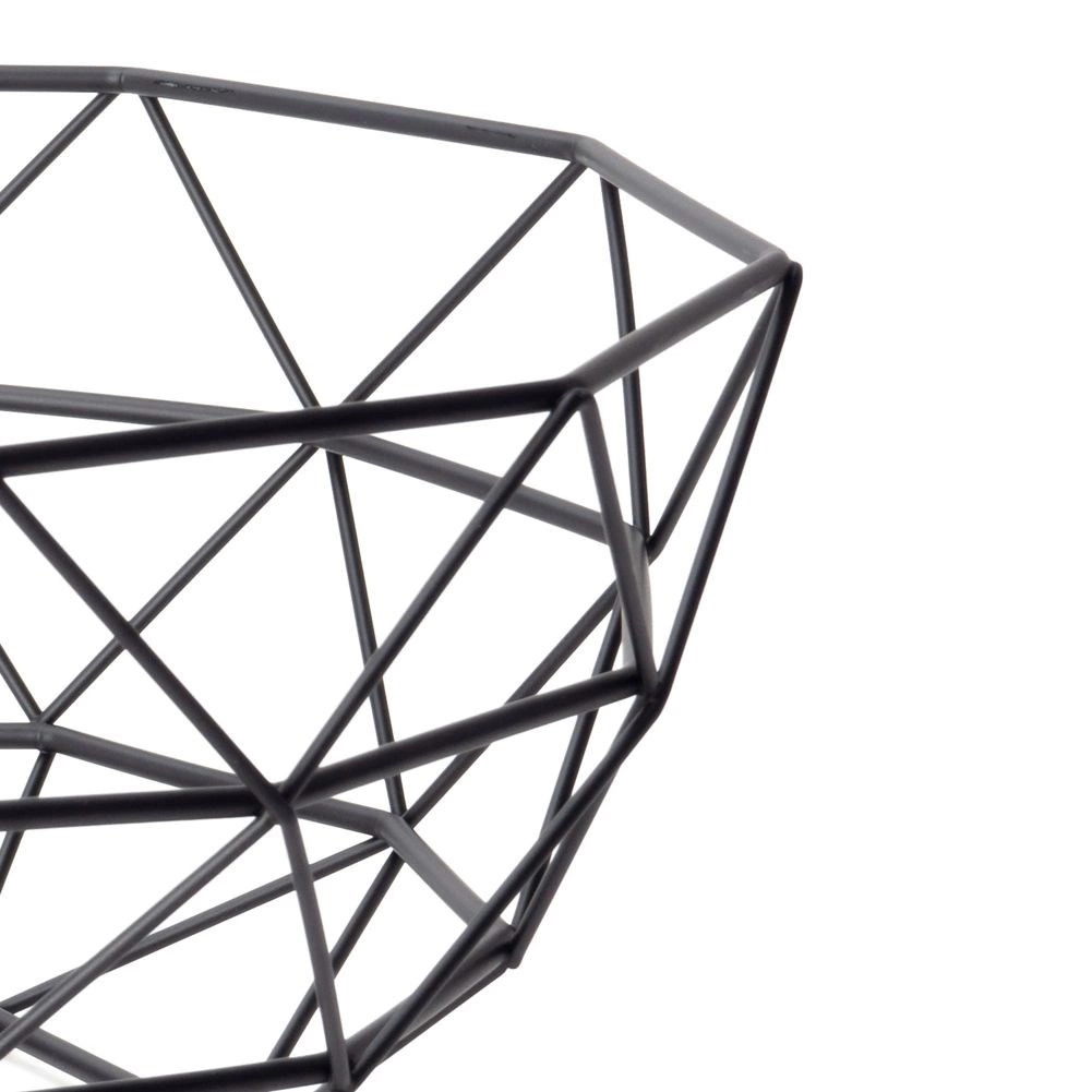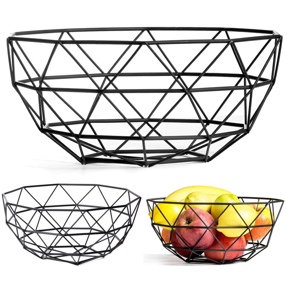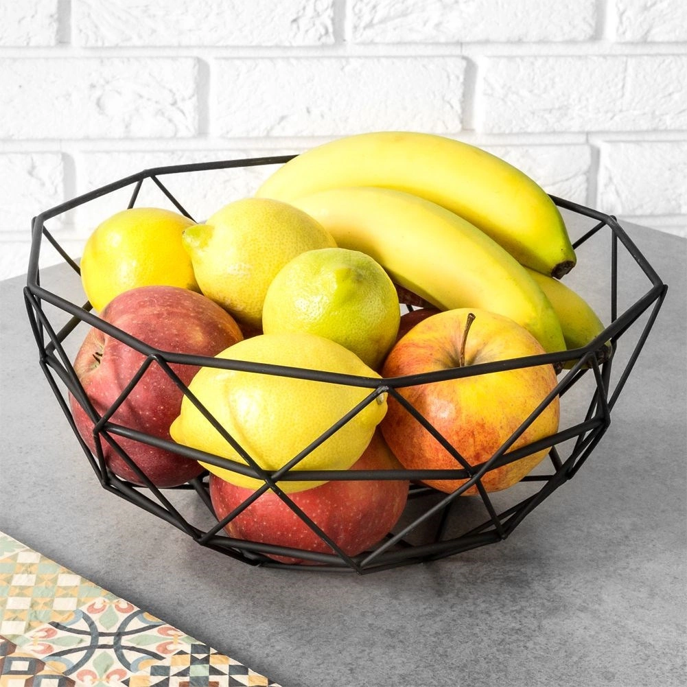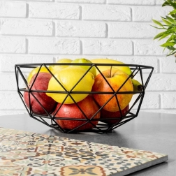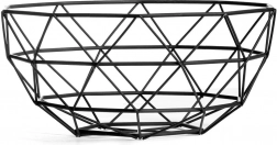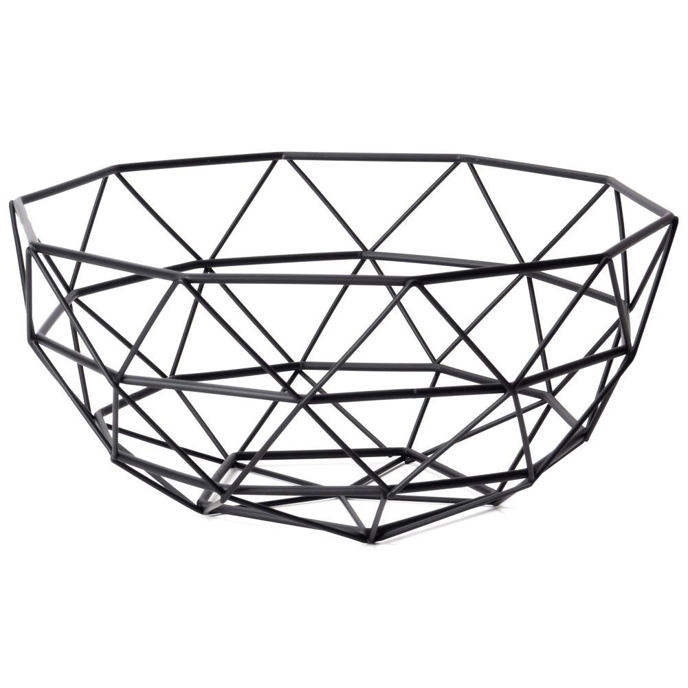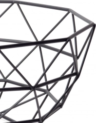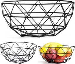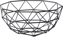 Stylowa metalowa misa na owoce o średnicy 28 cm w matowej czerni zachwyca nowoczesnym geometrycznym designem, jest stabilna i wytrzymała, a dzięki otwartej, drucianej konstrukcji utrzymuje owoce dłużej świeże. Doskonale pasuje do nowoczesnych, industrialnych i glamour wnętrz i sprawdzi się także do przechowywania drobiazgów.