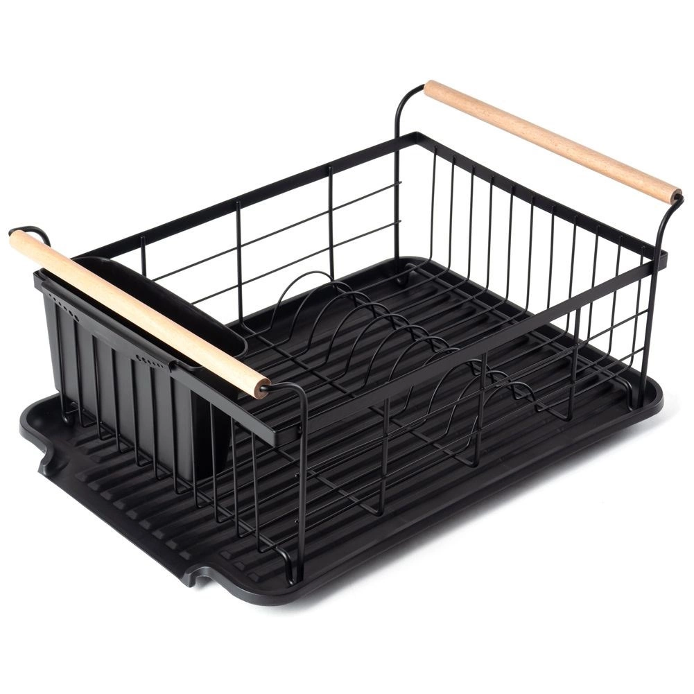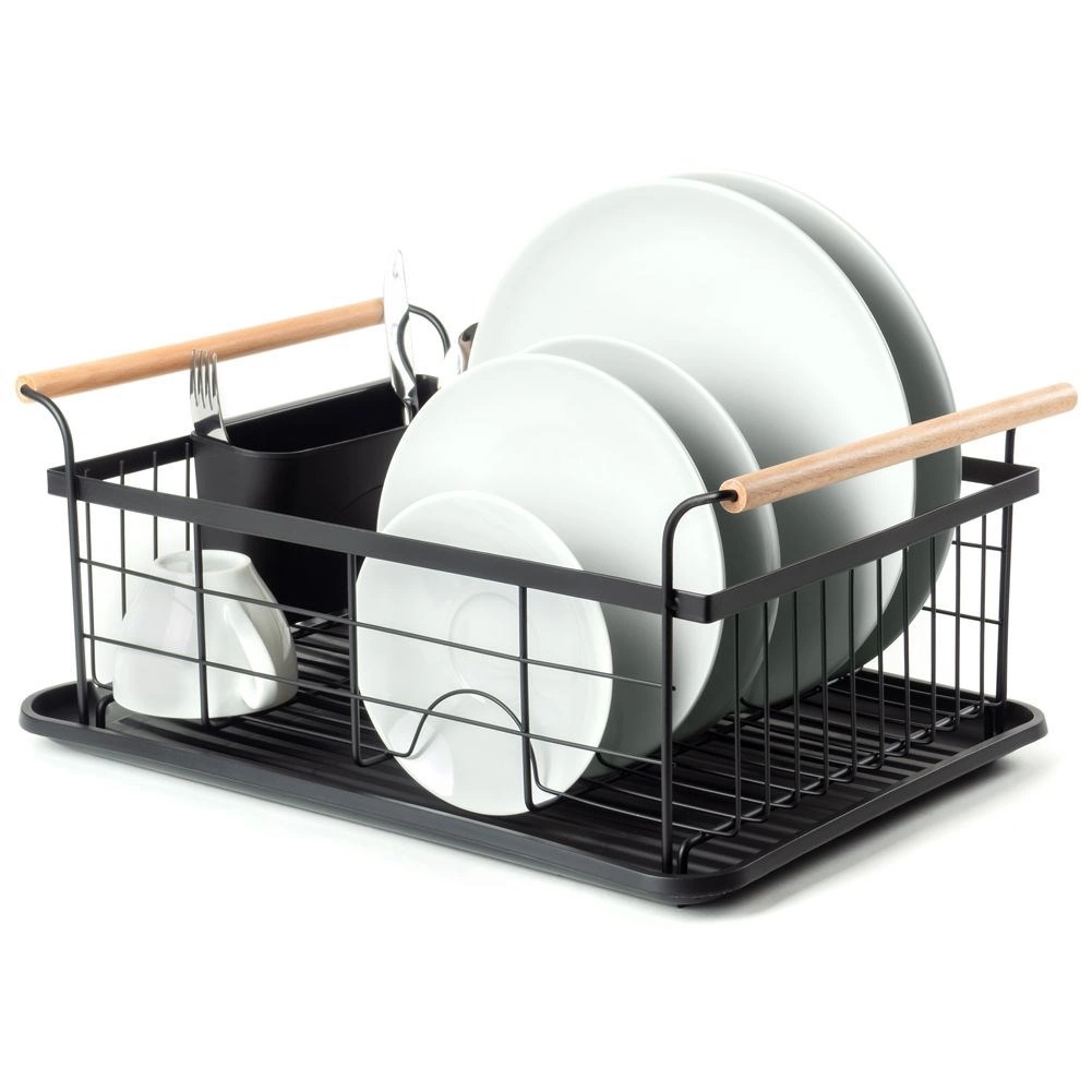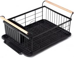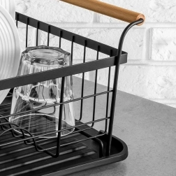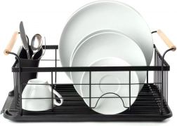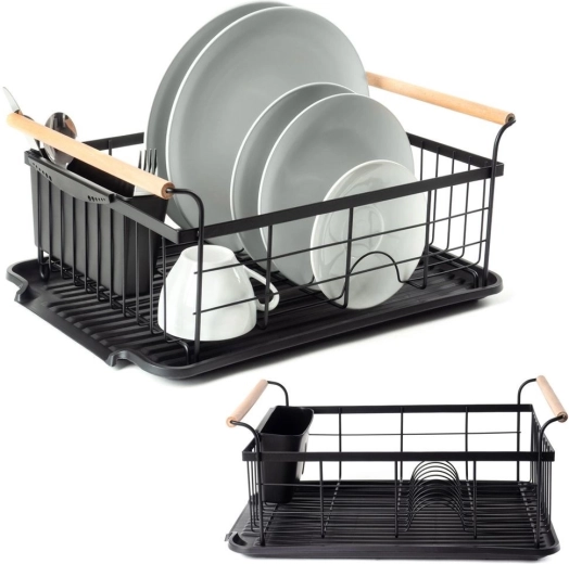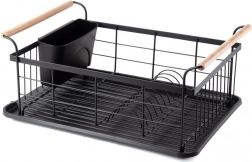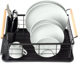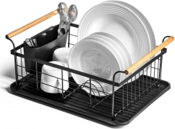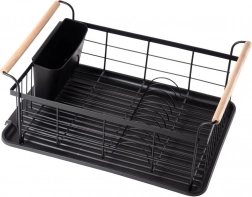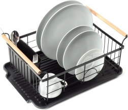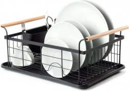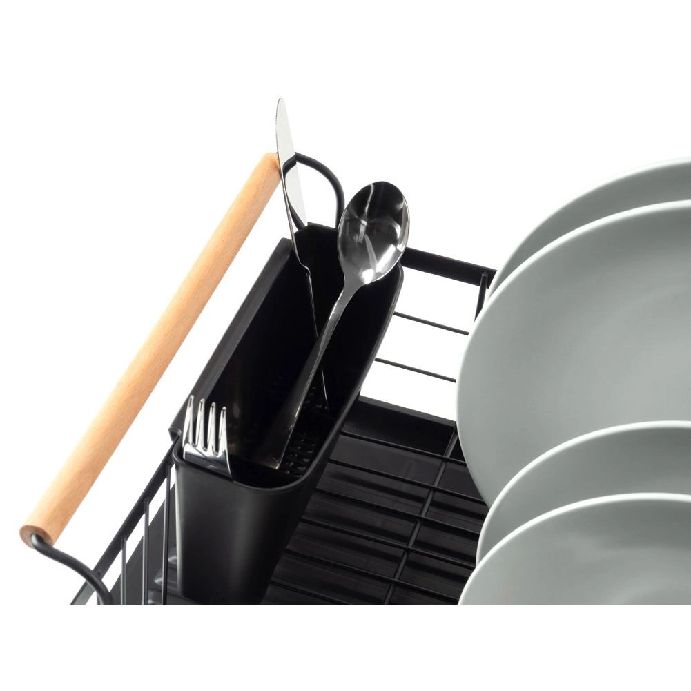 Stylowy czarny ociekacz do naczyń z drewnianymi uchwytami ułatwia codzienne zmywanie i utrzymuje blat kuchenny w suchości. Ma solidną metalową konstrukcję, wyjmowaną tacę ociekową oraz osobny koszyk na sztućce, który można zamocować wewnątrz lub na zewnątrz. Minimalistyczny design pasuje do nowoczesnych i klasycznych kuchni, a dzięki kompaktowym wymiarom zmieści się także na mniejszych blatach.