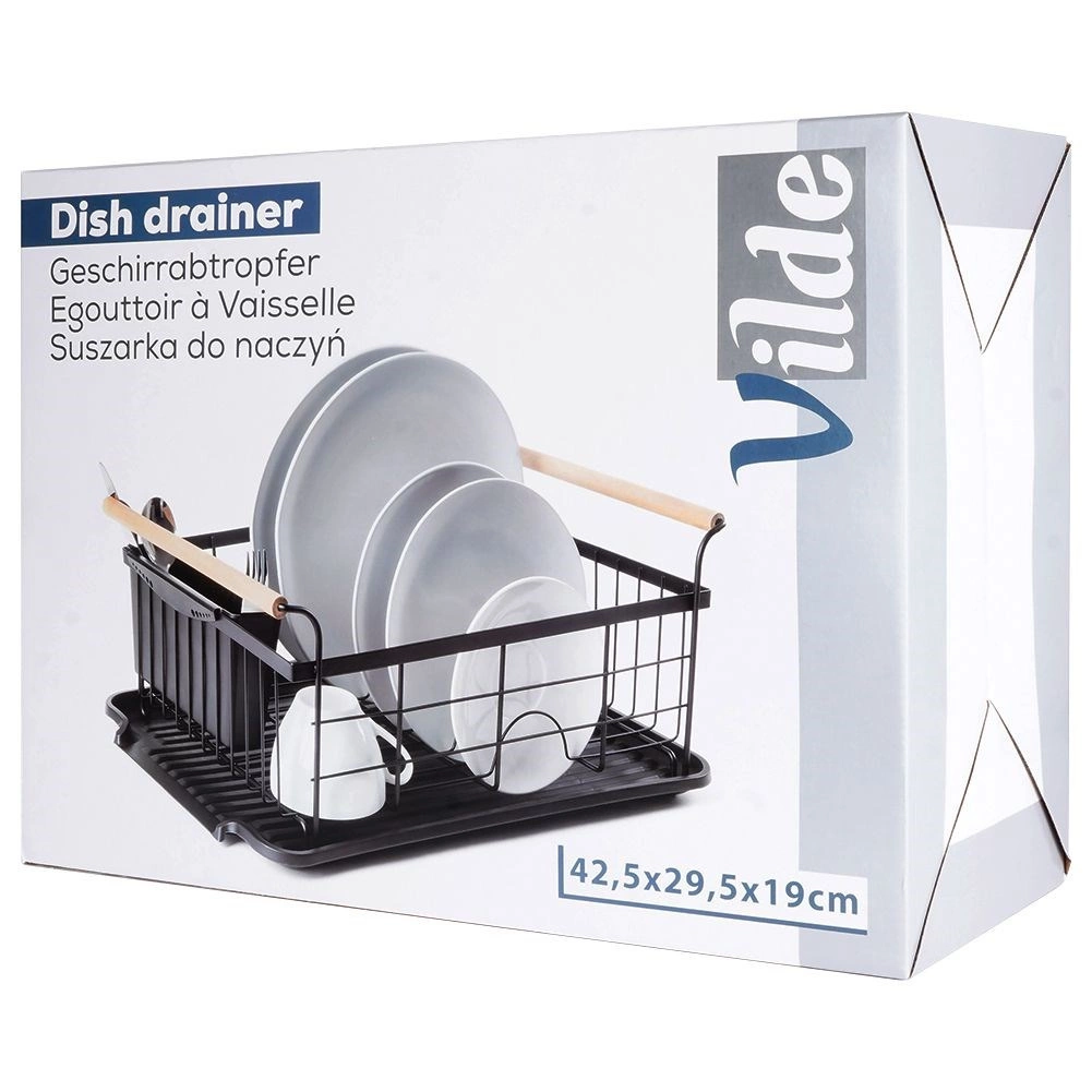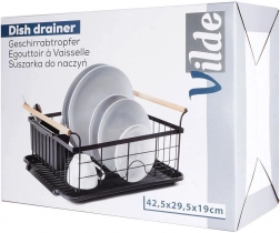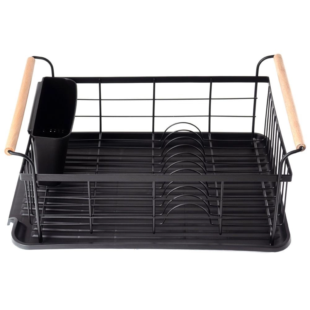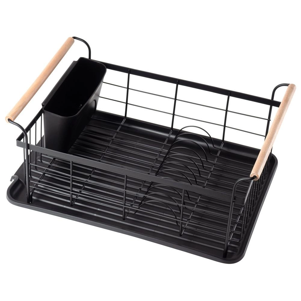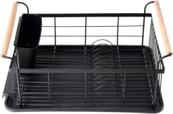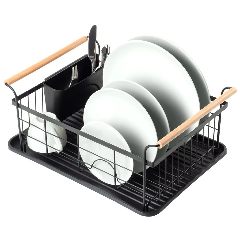 Stylowy czarny ociekacz do naczyń z drewnianymi uchwytami ułatwia codzienne zmywanie i utrzymuje blat kuchenny w suchości. Ma solidną metalową konstrukcję, wyjmowaną tacę ociekową oraz osobny koszyk na sztućce, który można zamocować wewnątrz lub na zewnątrz. Minimalistyczny design pasuje do nowoczesnych i klasycznych kuchni, a dzięki kompaktowym wymiarom zmieści się także na mniejszych blatach.