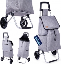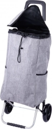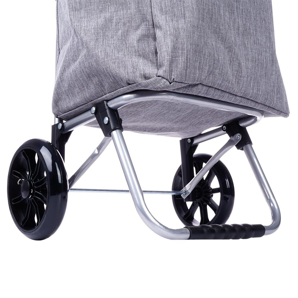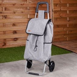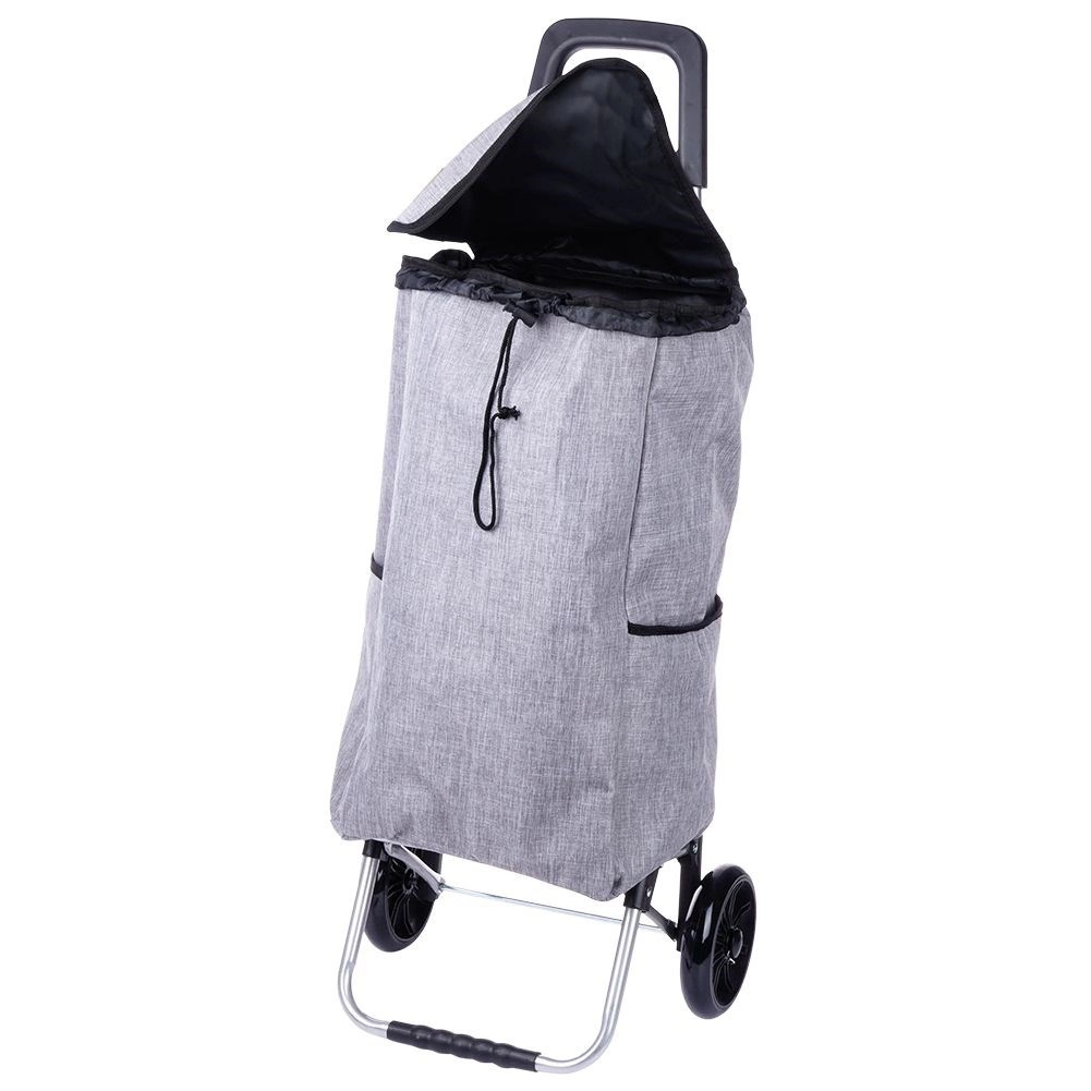Wózek zakupowy z szarą tekstylną torbą został zaprojektowany do wygodnego i bezpiecznego przewożenia zakupów. Lekka, a zarazem wytrzymała metalowa rama z dwoma dużymi plastikowymi kołami gwarantuje stabilność i płynny ruch. Torba jest chroniona klapą i zamykana na ściągany sznurek, dzięki czemu zawartość pozostaje bezpieczna nawet przy gorszej pogodzie.