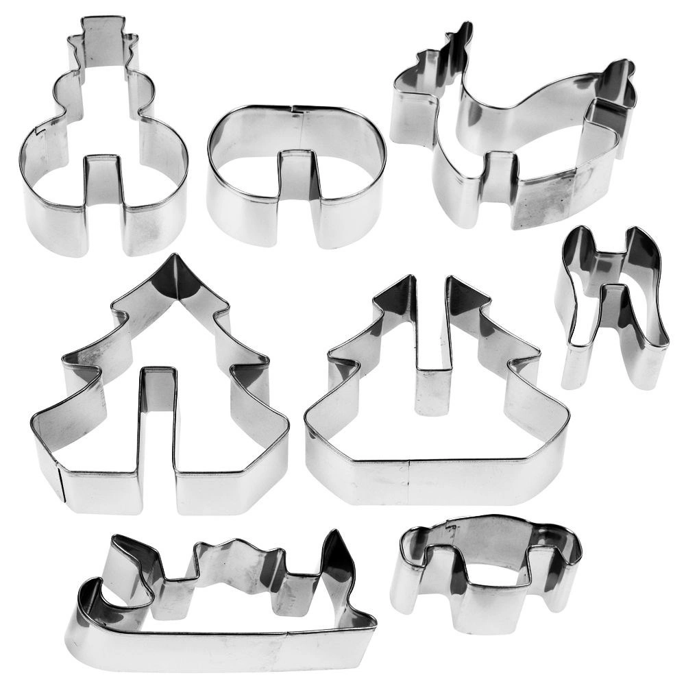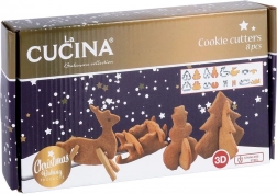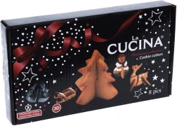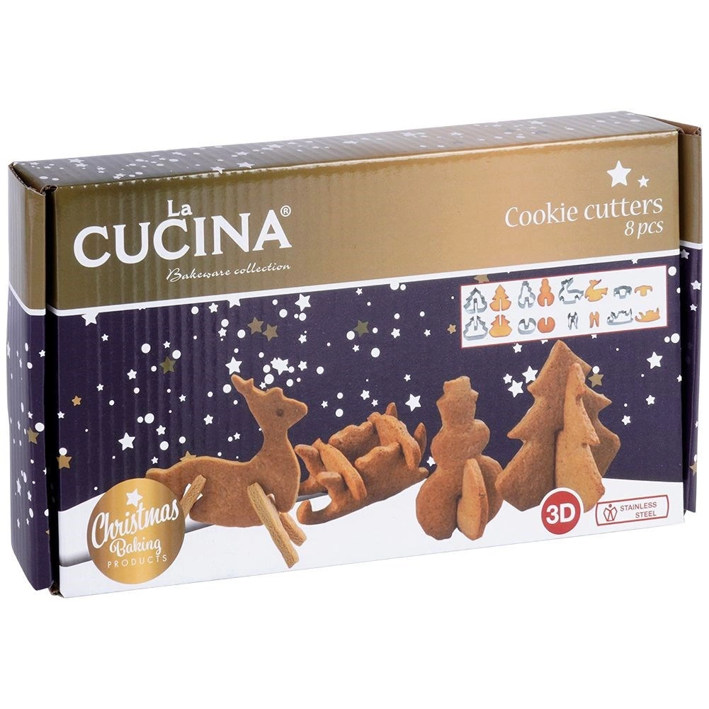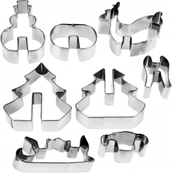 Zestaw zawiera 8 sztuk do przygotowania 4 różnych motywów 3D: choinka, bałwanek, renifer i sanie. Wymiary poszczególnych elementów wynoszą orientacyjnie szerokość 4,5–9,5 cm i długość 3,5–8,5 cm. Wykrawacze są uniwersalne – nadają się także do fondantu i mas modelujących do dekoracji tortów oraz deserów.