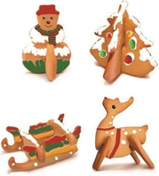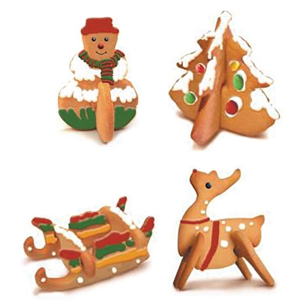 Zestaw wycina elementy, które po upieczeniu łączą się w stojące figurki – choinkę, bałwanka, renifera i sanie. Idealny do świątecznego pieczenia i dekoracji.