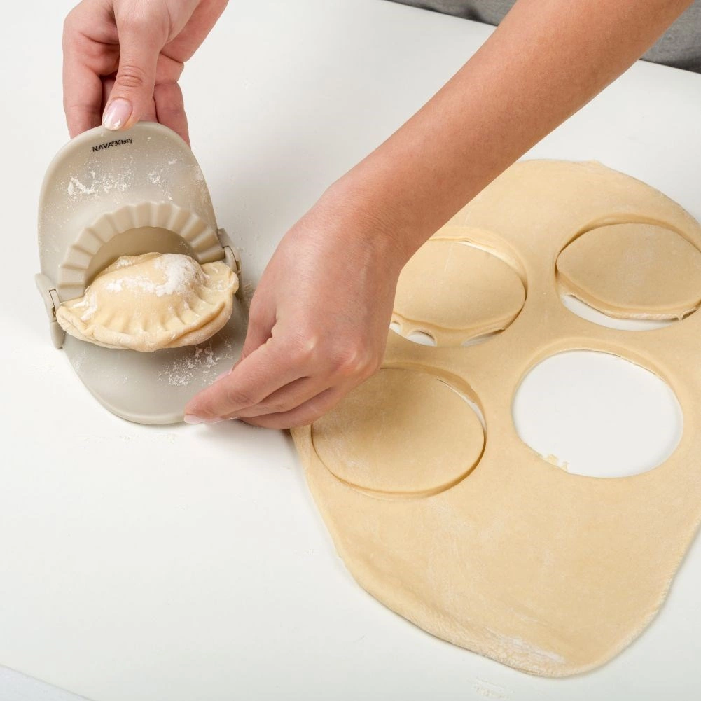 Z tą formą do pierogów przygotujesz szybko i bez bałaganu idealnie uformowane, szczelnie zamknięte pierożki z ulubionym nadzieniem – mięsnym, warzywnym czy serowym. Wystarczy rozwałkować ciasto, wyciąć krążki, ułożyć je na formie, dodać farsz i złączyć połówki, aby uzyskać równy brzeg.