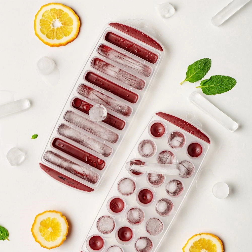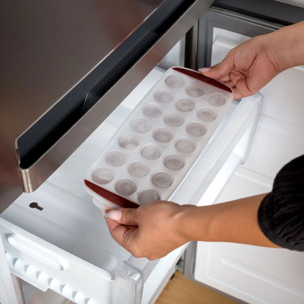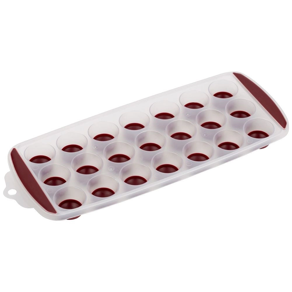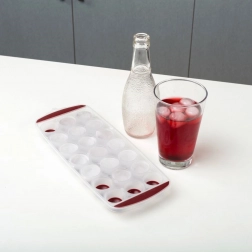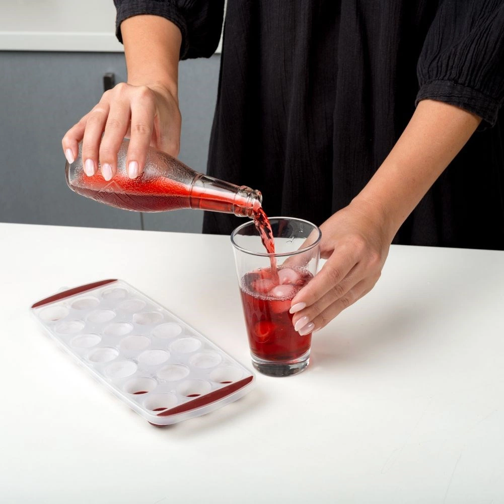 Praktyczna silikonowa forma do lodu do przygotowania aż 21 okrągłych kostek z elastycznym dnem dla łatwego wyjmowania. Łączy bezpieczne materiały (plastik i silikon) z antypoślizgowymi uchwytami w kolorze bordo. Idealna do wody, lemoniad i koktajli, odpowiednia także do mrożenia soków i sorbetów. Łatwa w utrzymaniu, odpowiednia do zmywarki.