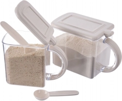 Funkcjonalne wykonanie ułatwia codzienne użytkowanie: pokrywka na zawiasie chroni przed wilgocią i dłużej utrzymuje świeżość produktów, ergonomiczny uchwyt pozwala na wygodne przenoszenie, a dołączona łyżeczka zapewnia szybkie i higieniczne dozowanie. Pojemnik oszczędza miejsce i sprawdzi się w domu oraz gastronomii.