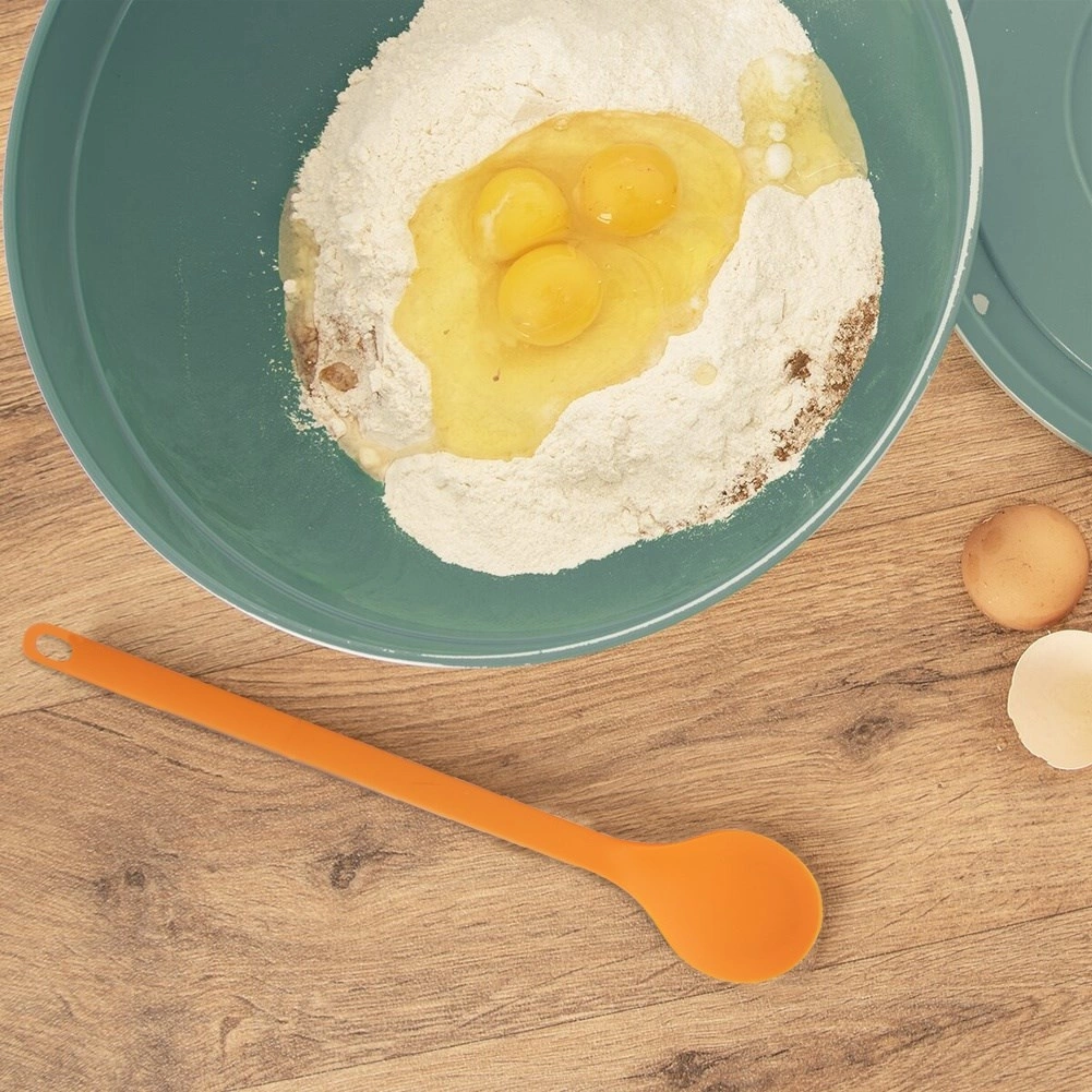 Dzięki metalowemu wzmocnieniu wewnątrz łyżka zachowuje kształt i poradzi sobie z gęstszymi ciastami czy cięższymi mieszankami. Antypoślizgowy uchwyt świetnie leży w dłoni, a oczko na końcu pozwala na zawieszenie na relingu. Materiał nie pochłania zapachów ani płynów i można go myć w zmywarce, więc pielęgnacja jest szybka i higieniczna.
