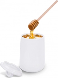 Pojemnik wykonany jest z trwałej białej porcelany, a łyżeczka z naturalnego drewna, co zapewnia wygodne i delikatne nabieranie miodu.