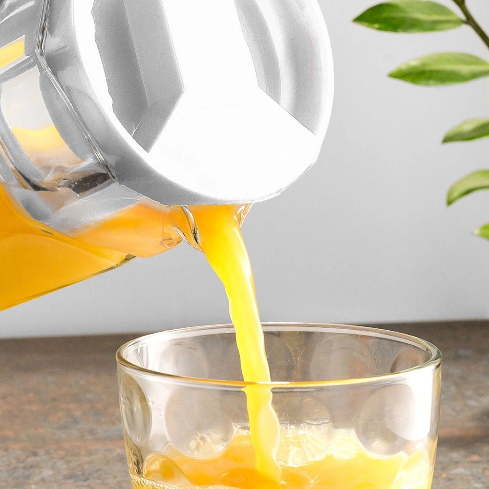 Wyprofilowany dziobek i solidne ucho zapewniają precyzyjne i płynne nalewanie. Idealny do soków, wody i lemoniady — bez bałaganu na stole.